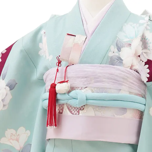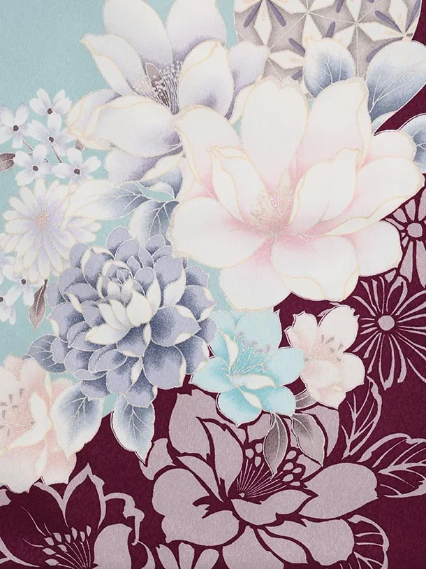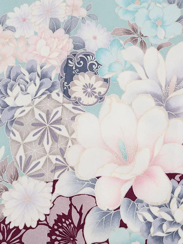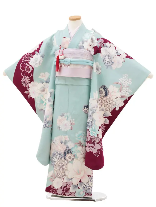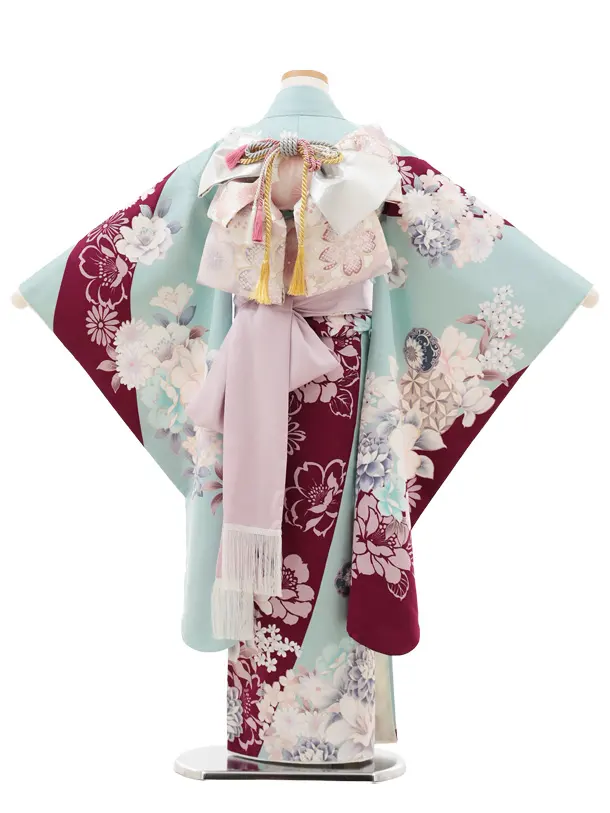 七五三(7歳結び帯)Y565 ペールブルー ボルドー 鞠 ブーケ