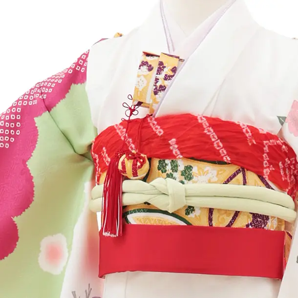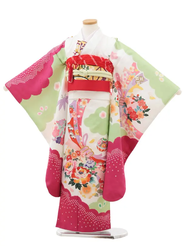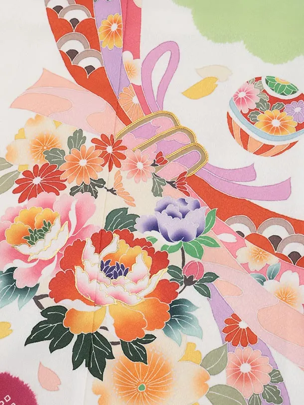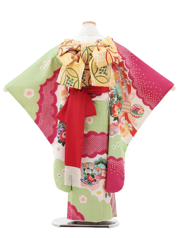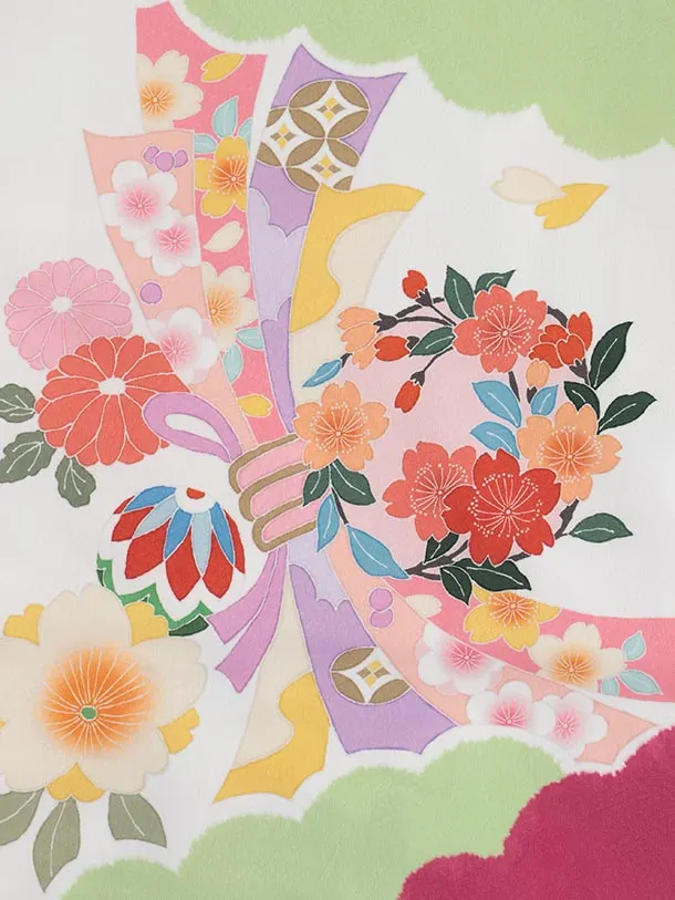 七五三(7歳結び帯)Y579 白ヒワピンク 束ね熨斗 牡丹