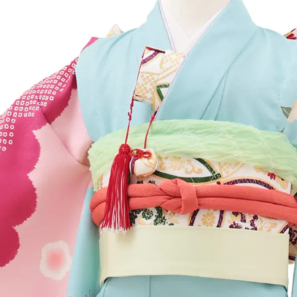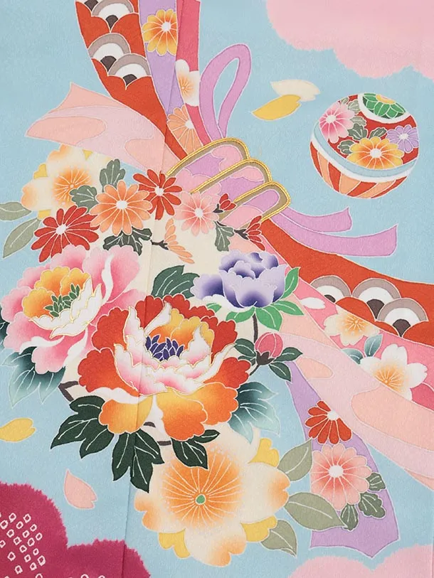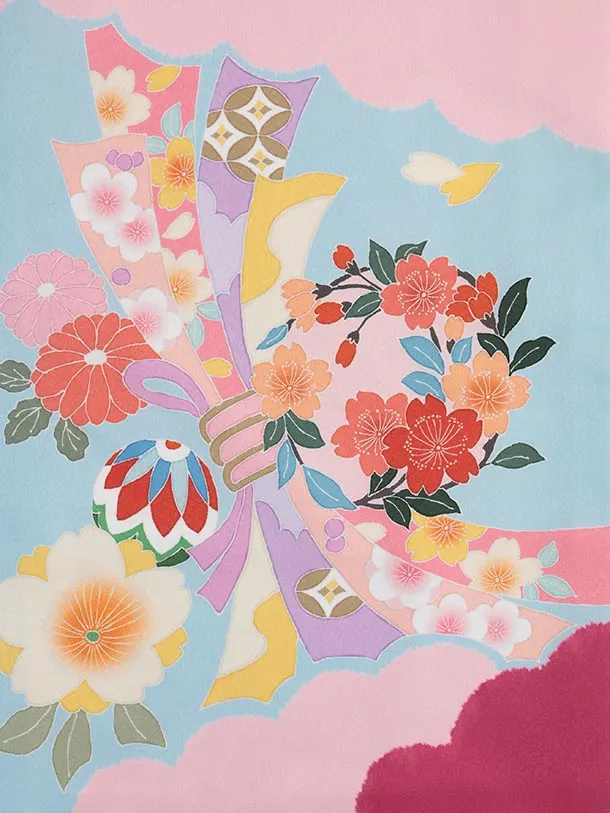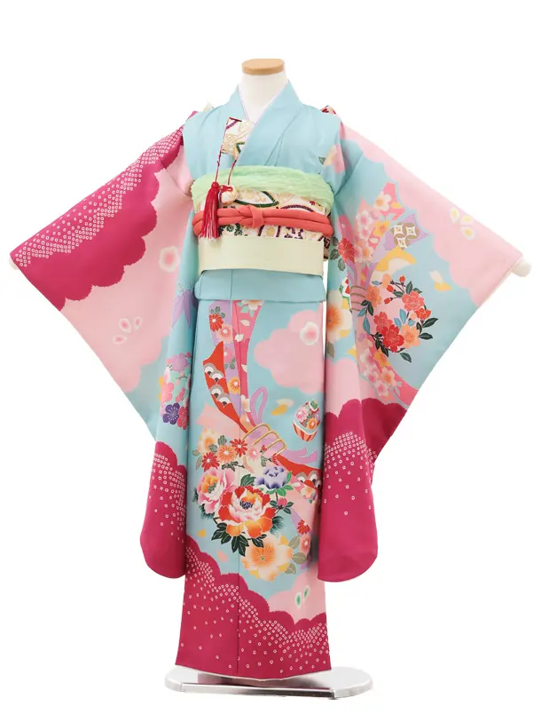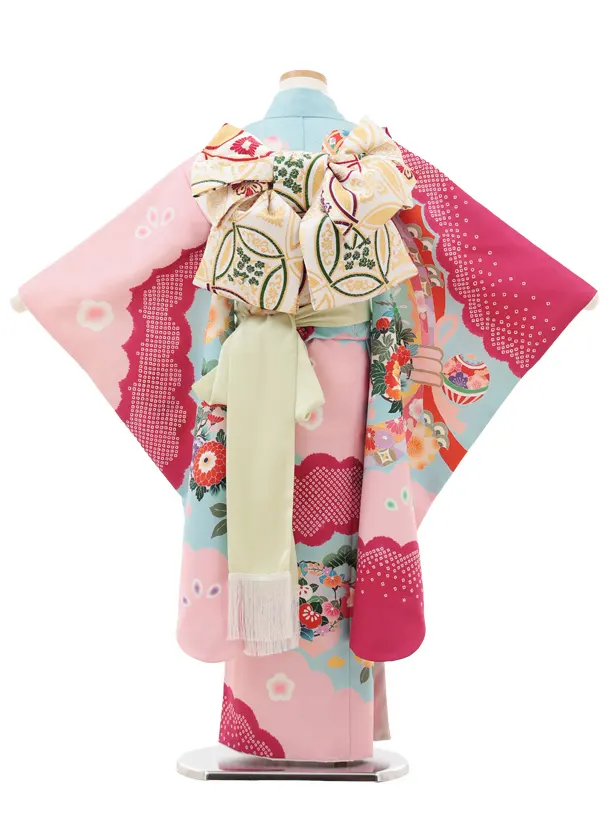七五三(7歳結び帯)Y584 水色ピンク 束ね熨斗 牡丹