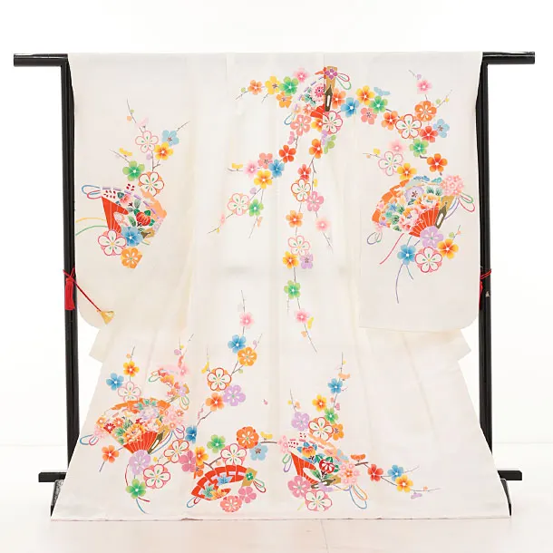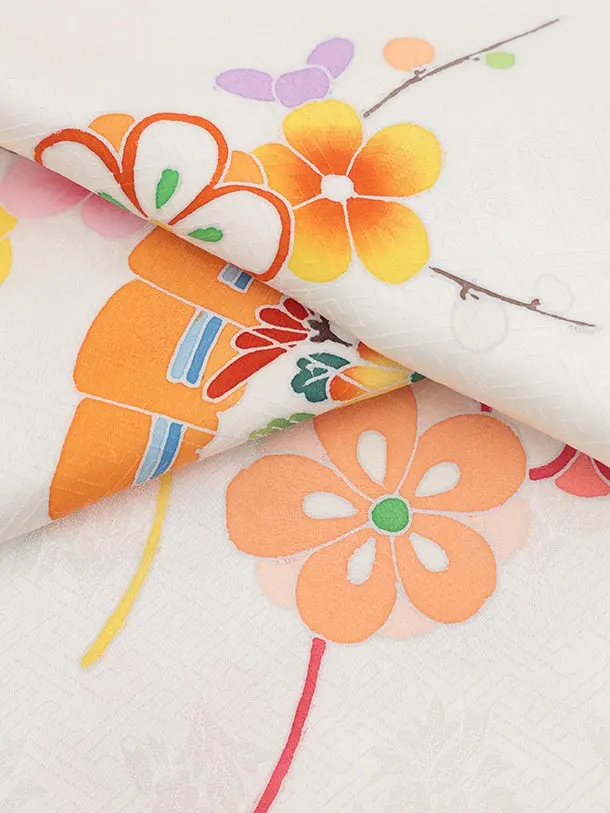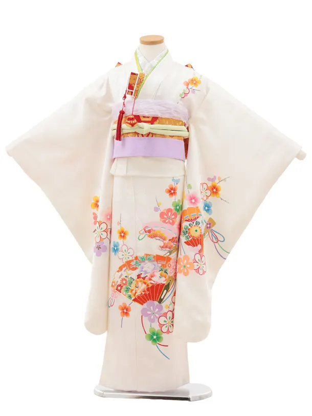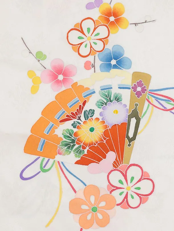 七五三(7歳結び帯)Y621【正絹】白地 檜扇に梅