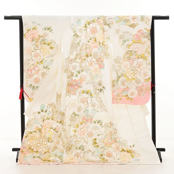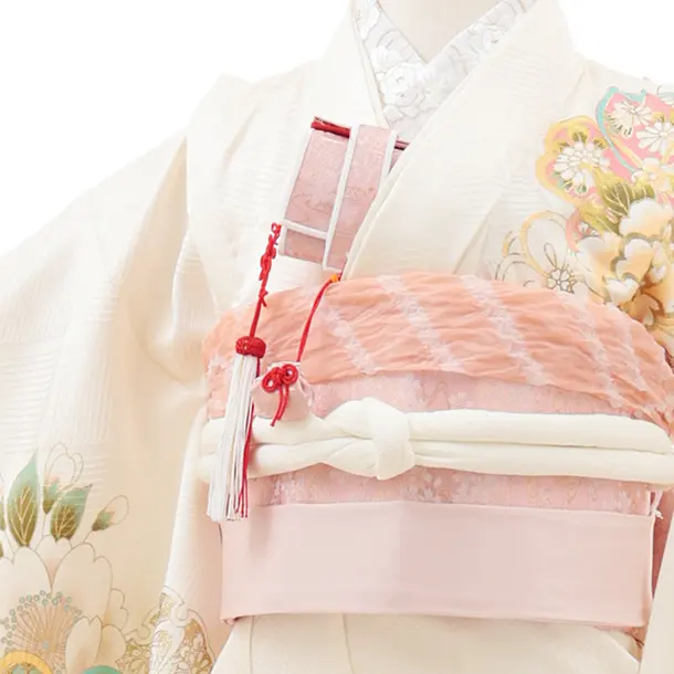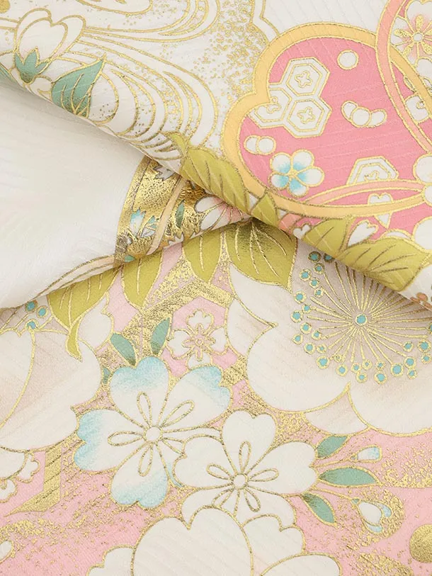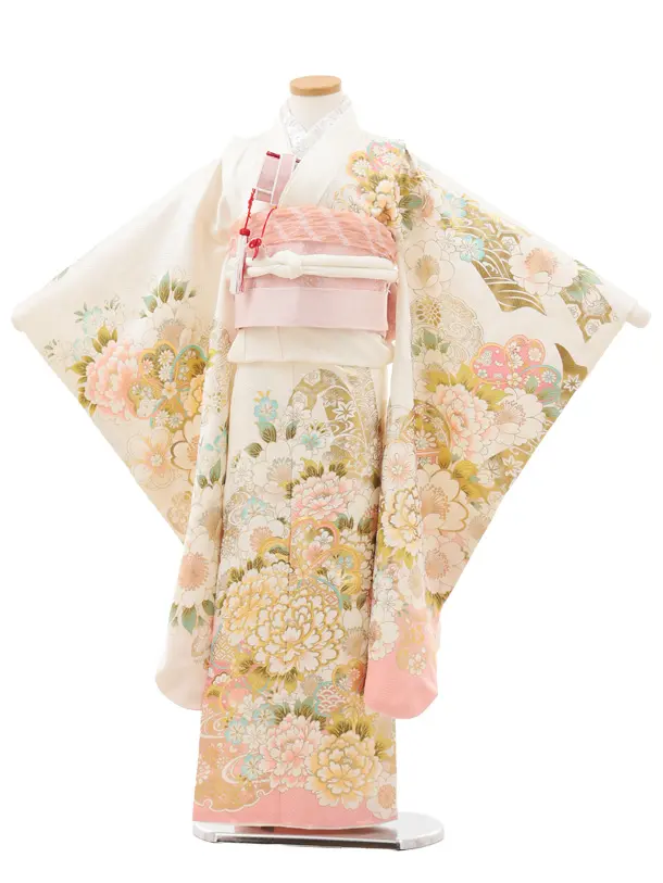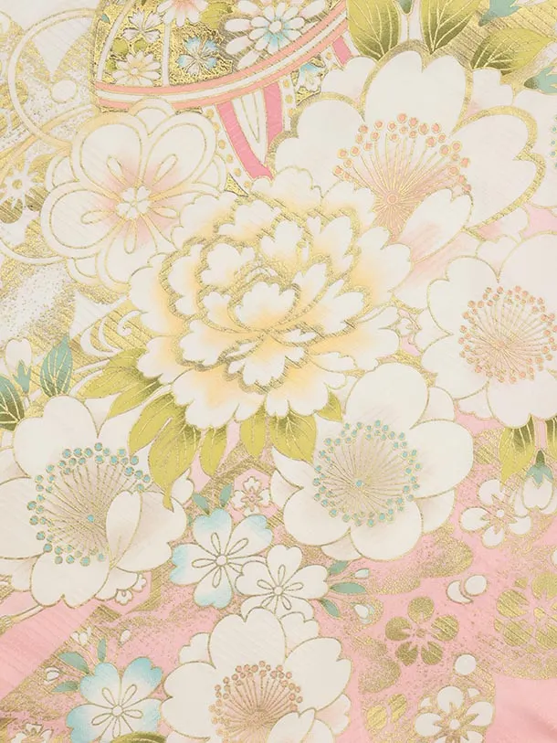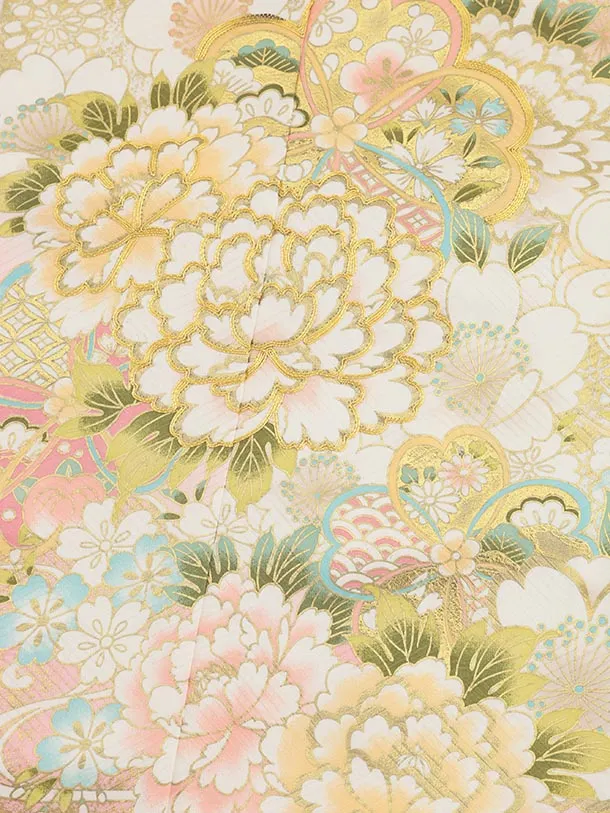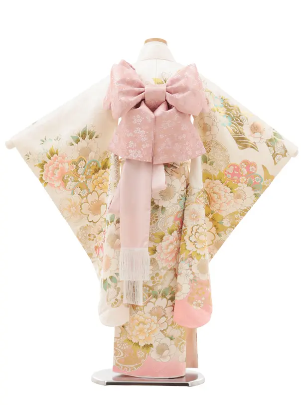 七五三(7歳結び帯)Y623【正絹】オフ白 裾ピンク 金彩 牡丹