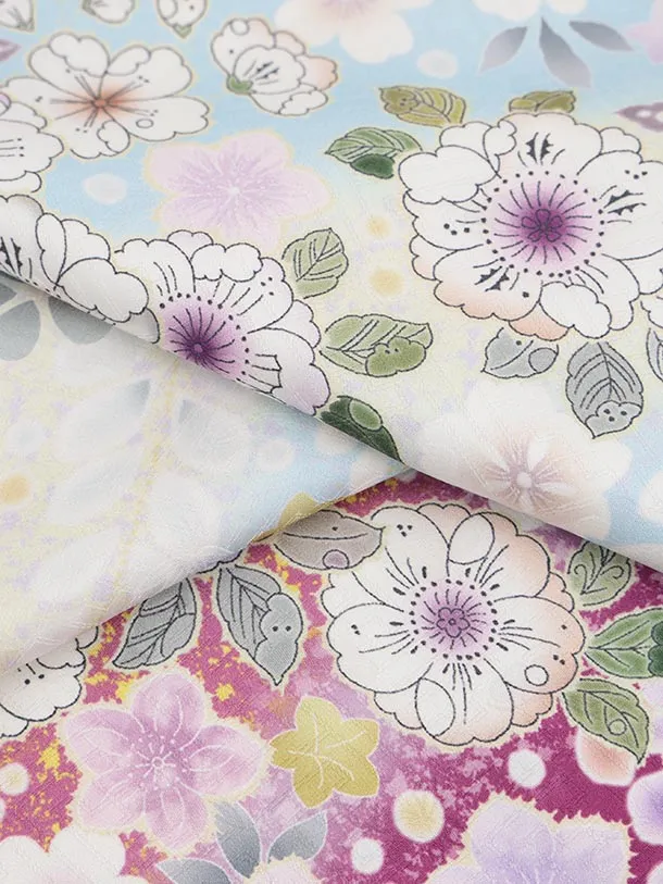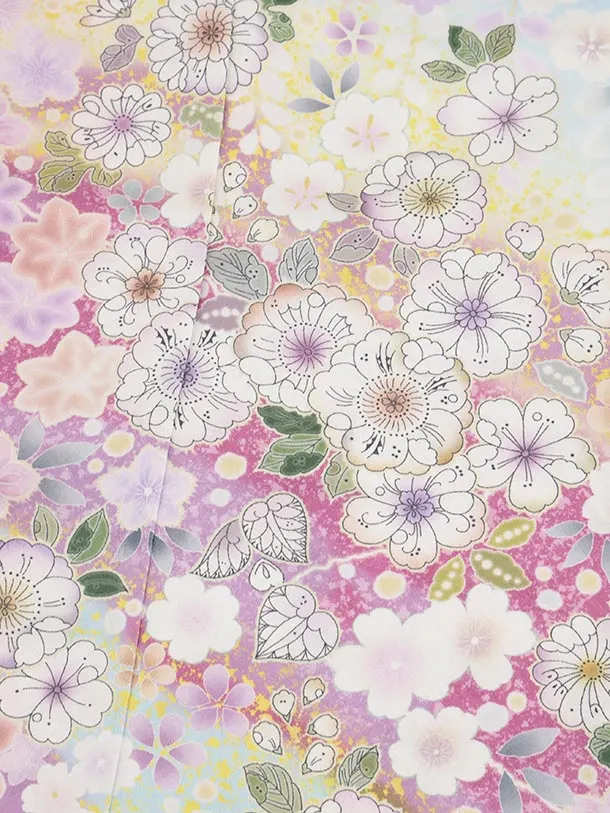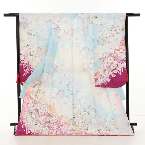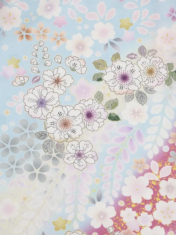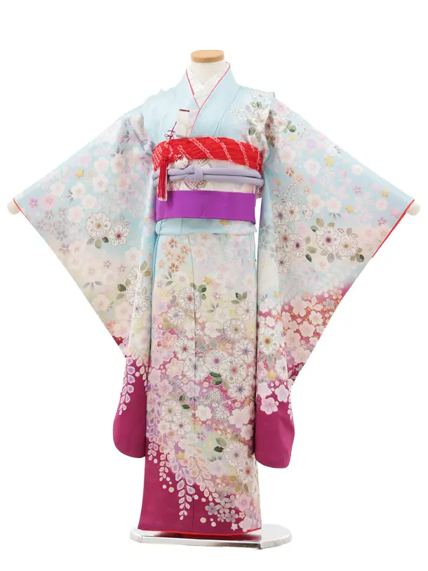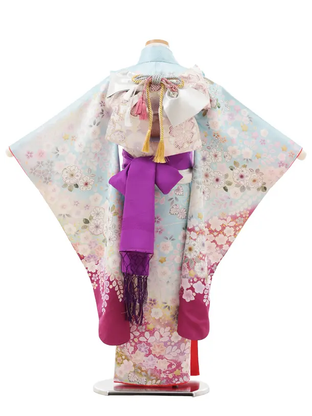 七五三(7歳結び帯)Y629【正絹】水色 裾パープル 辻が花調