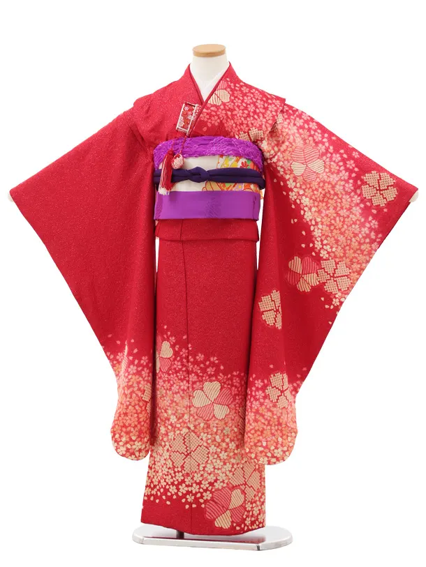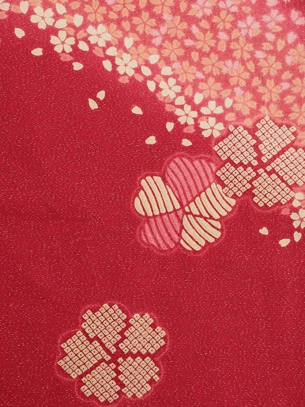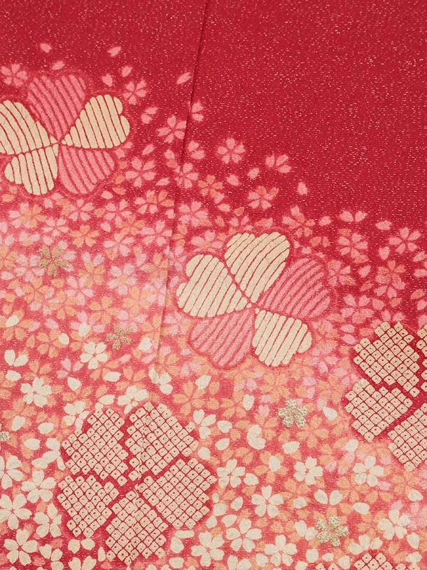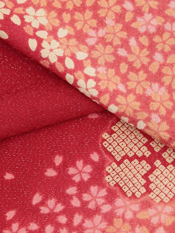 七五三(7歳袋帯)Y633【高級正絹】赤地 ラメ 花流し