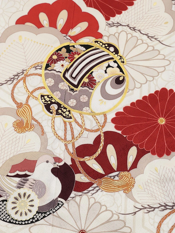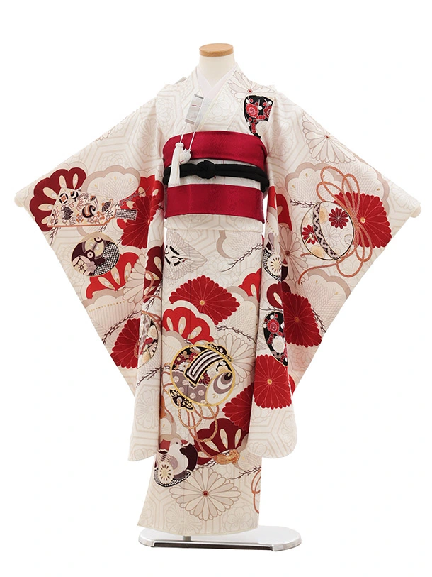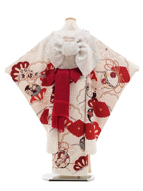七五三(7歳女児結び帯) 高級正絹Y645 紅一点 白地 小槌に菱菊