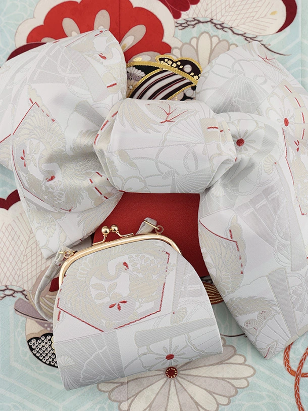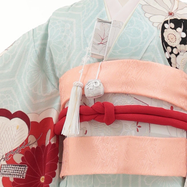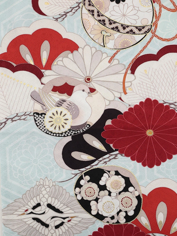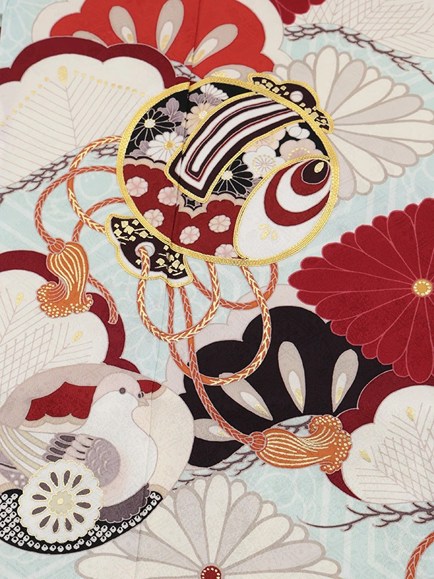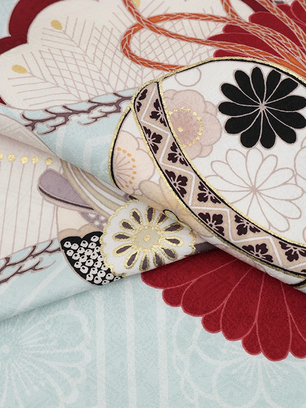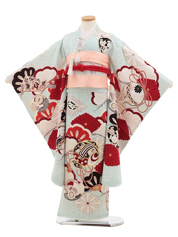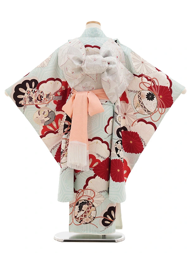 七五三(7歳女児結び帯) 高級正絹Y646 紅一点 水色地 小槌に菱菊