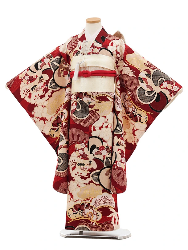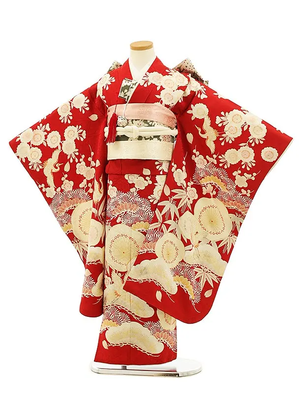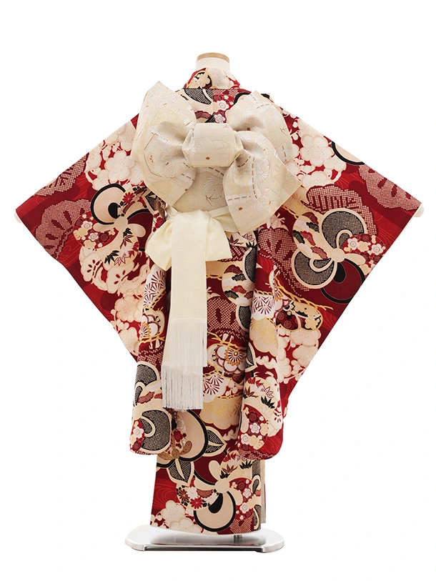 七五三(7歳女児結び帯) 高級正絹Y647 紅一点 赤地 ねじり梅に橘