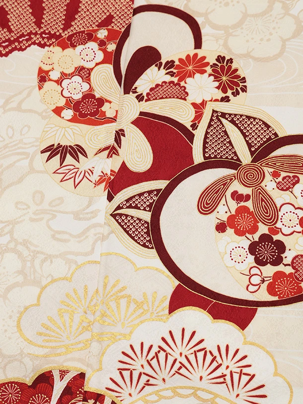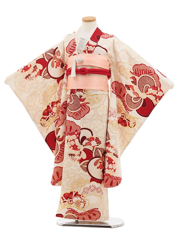七五三(7歳女児結び帯) 高級正絹Y648 紅一点 クリーム地 ねじり梅に橘