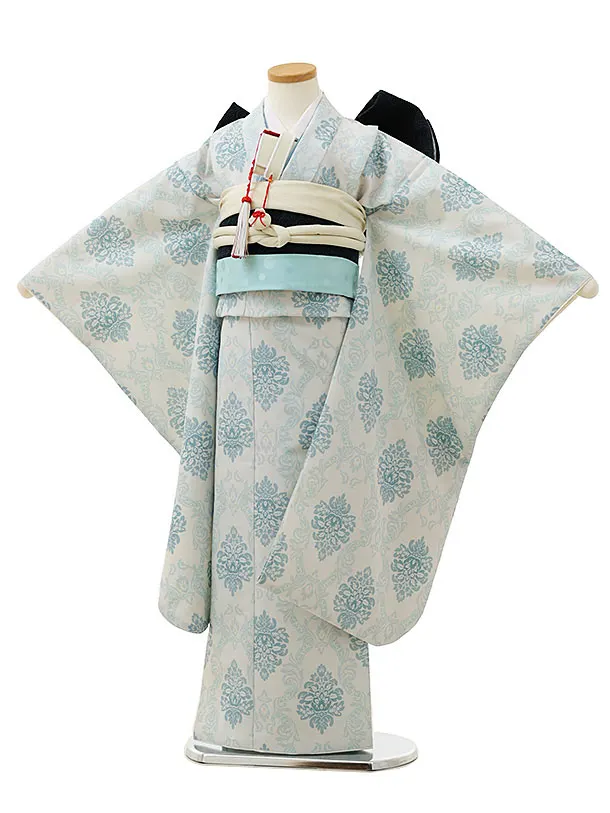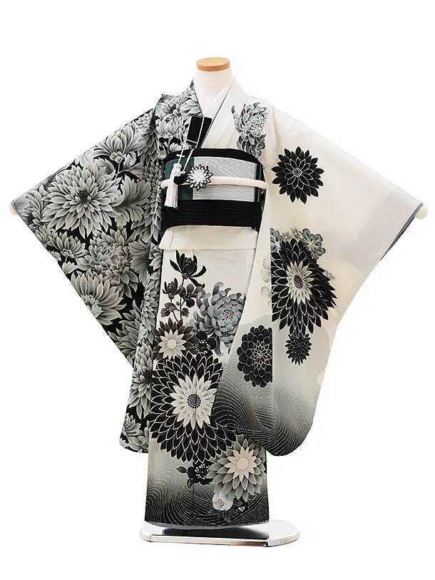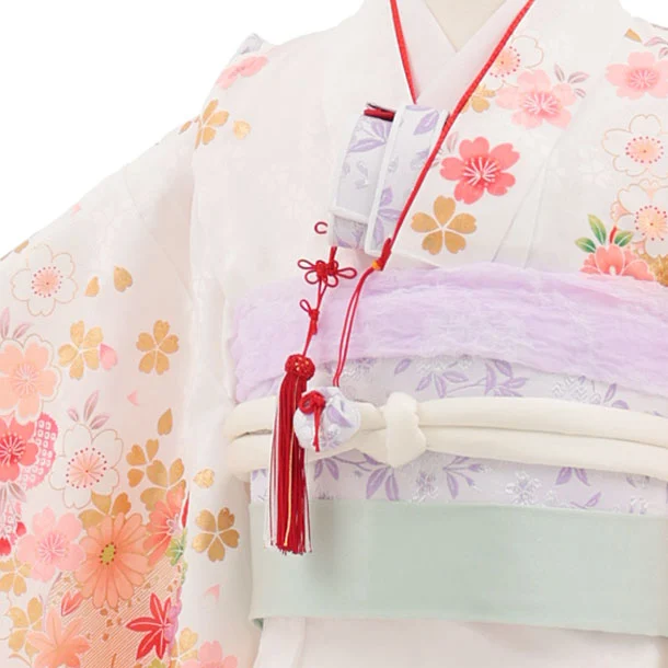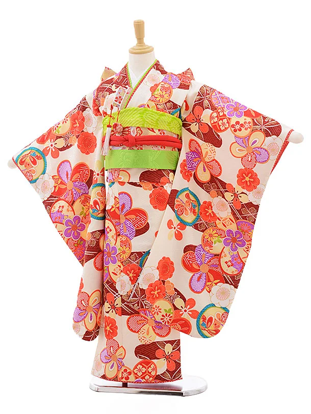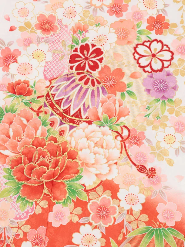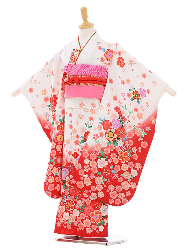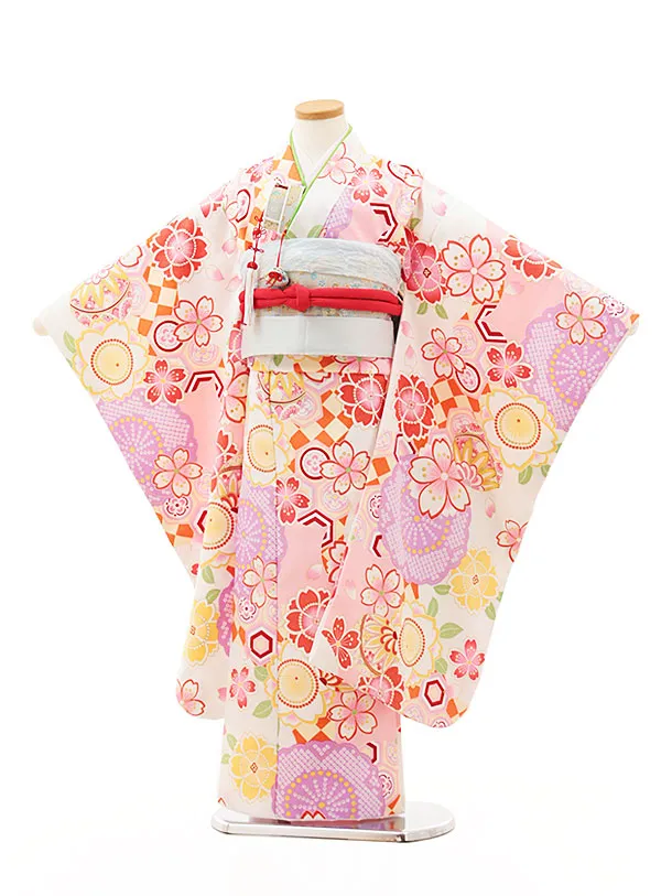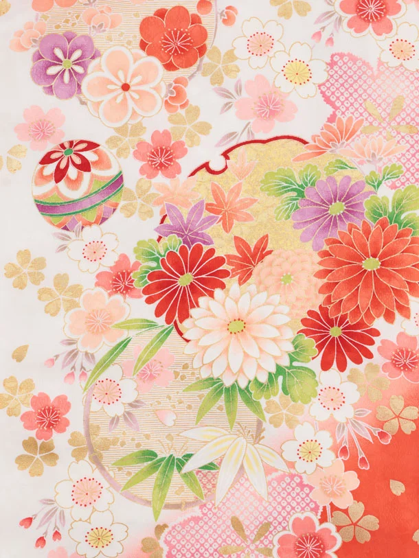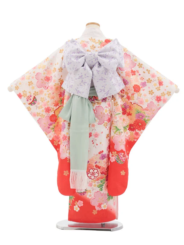 七五三(7歳結び帯)Y653 白地裾オレンジ鞠 桜牡丹