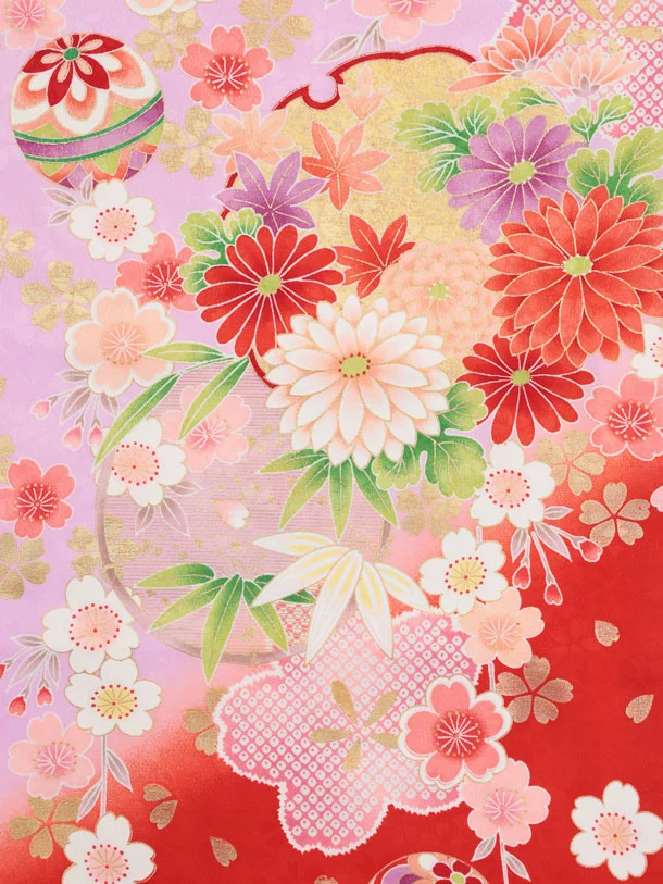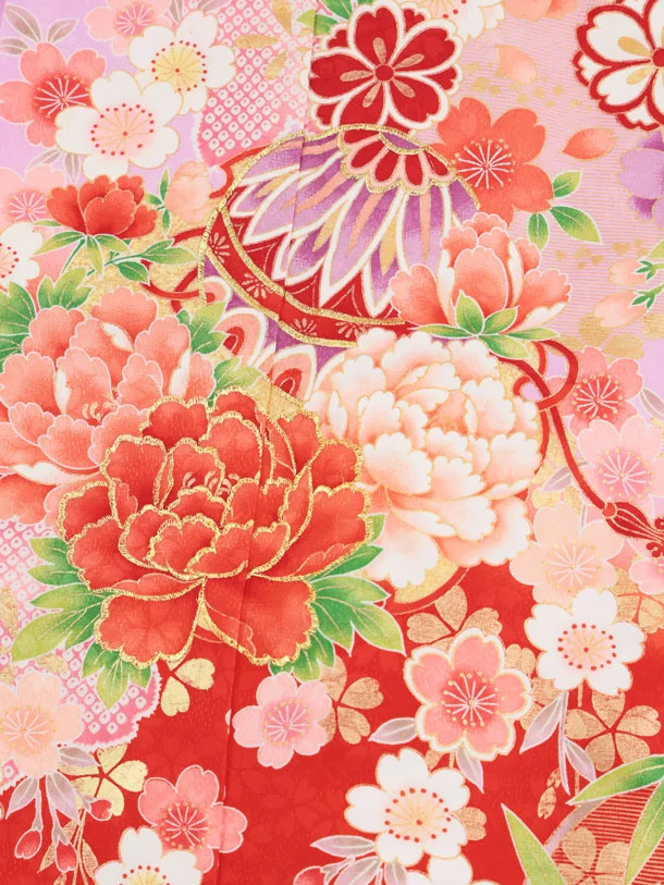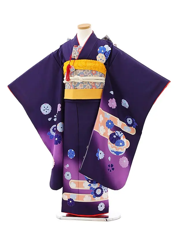 七五三(7歳結び帯)Y670 パープル裾赤 鞠にぼたん桜
