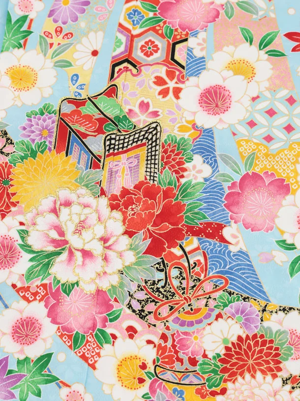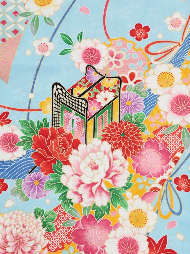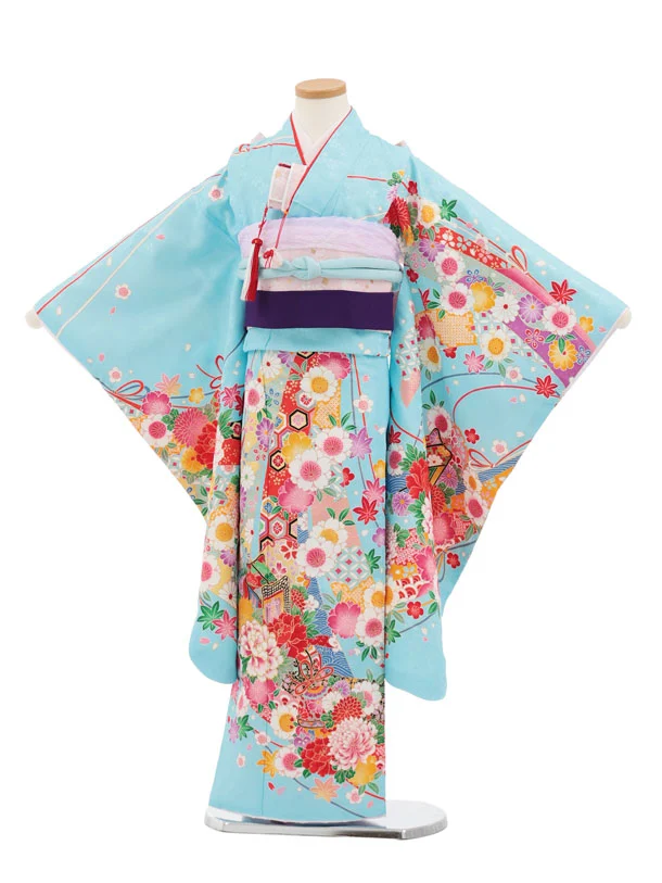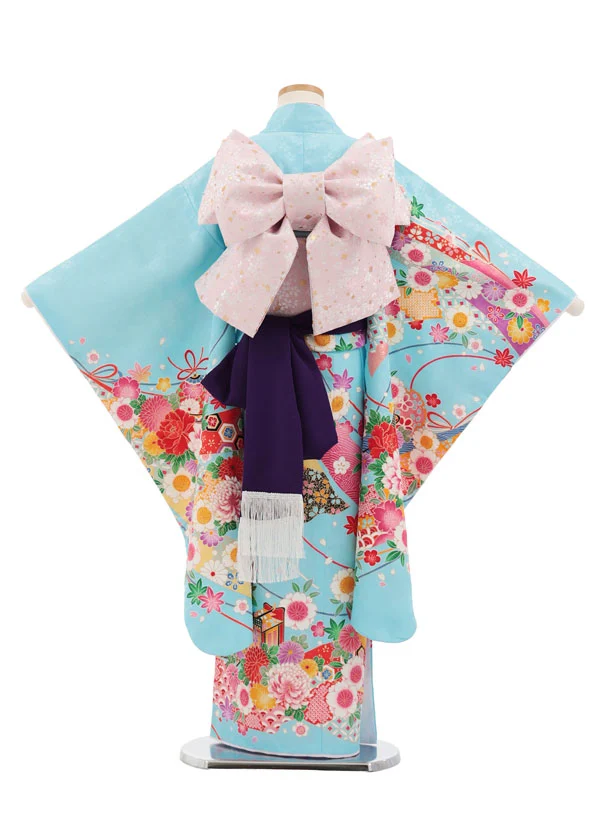 七五三(7歳結び帯)Y671 水色 御所車鈴花づくし
