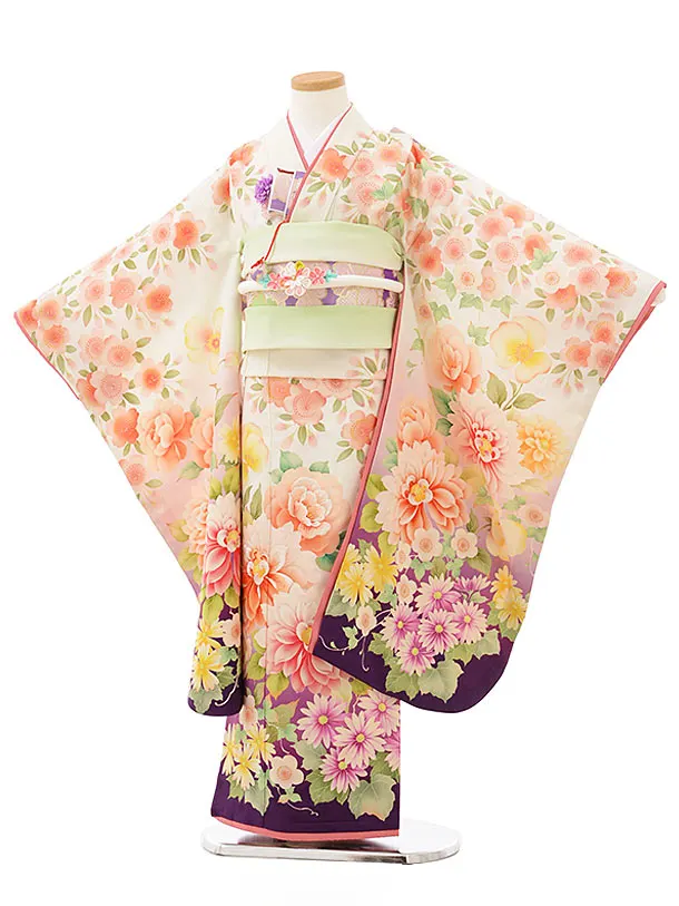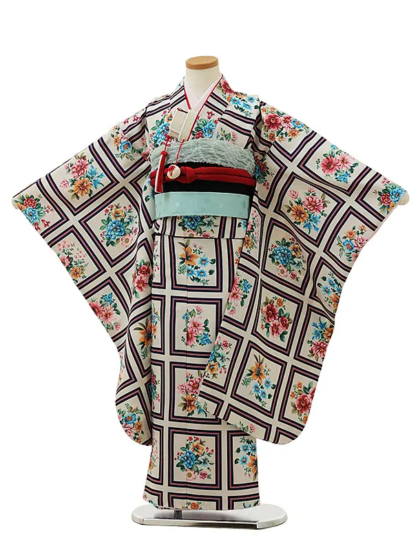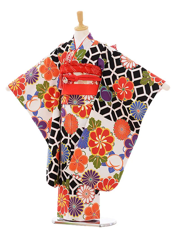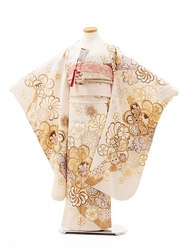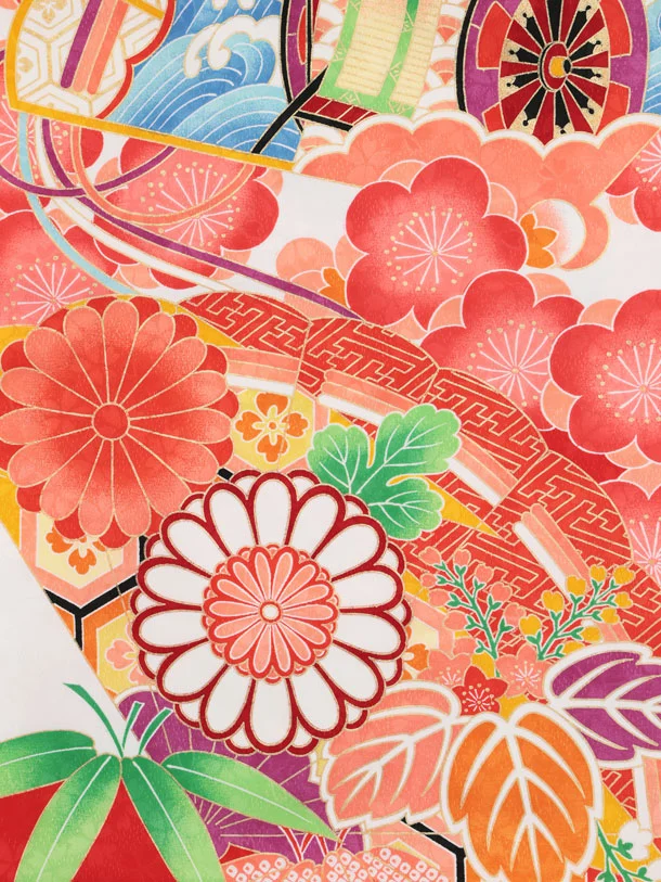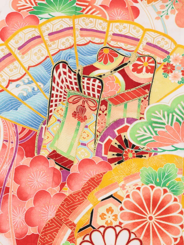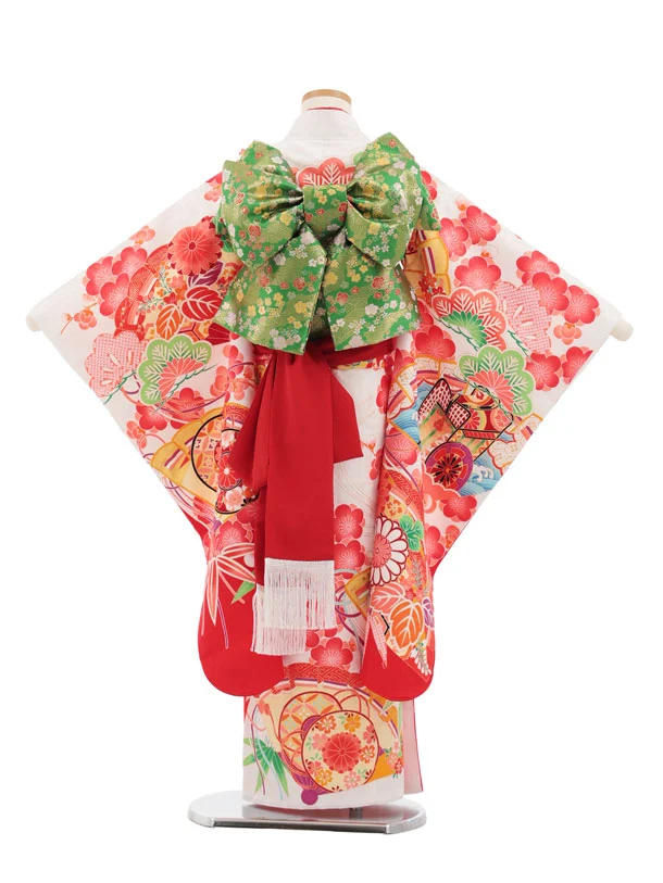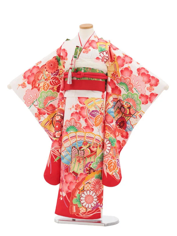 七五三(7歳結び帯)Y673 白地裾赤 桧扇に御所車花づくし