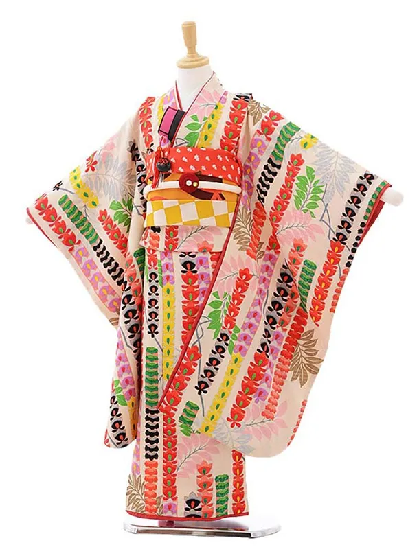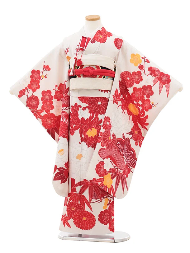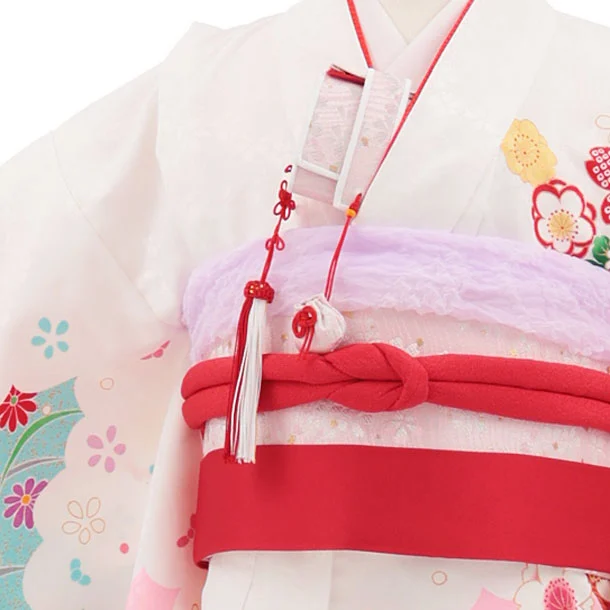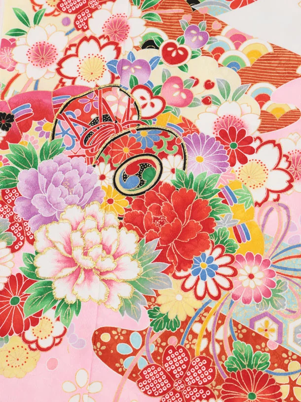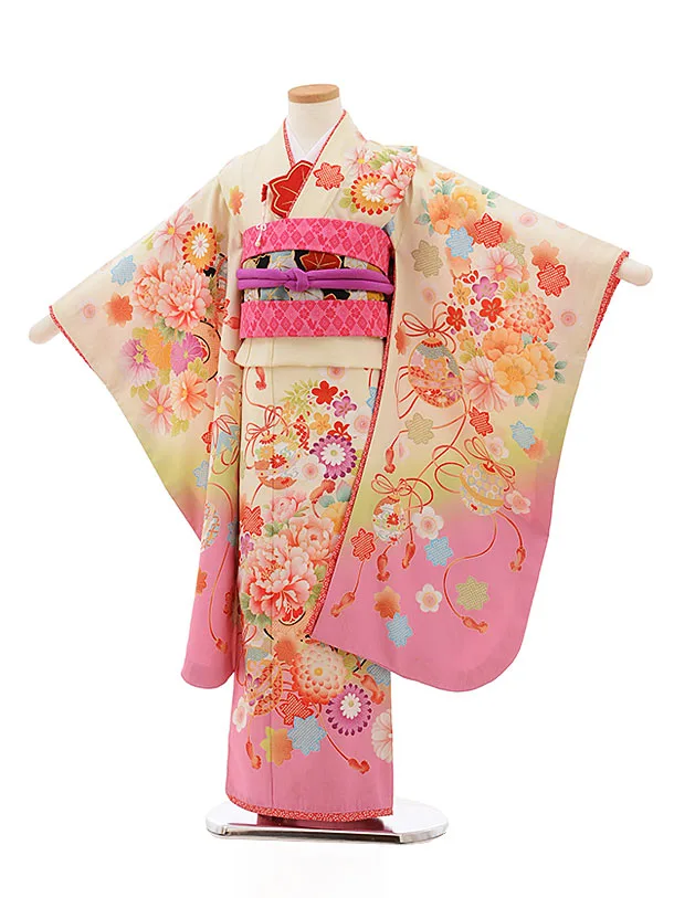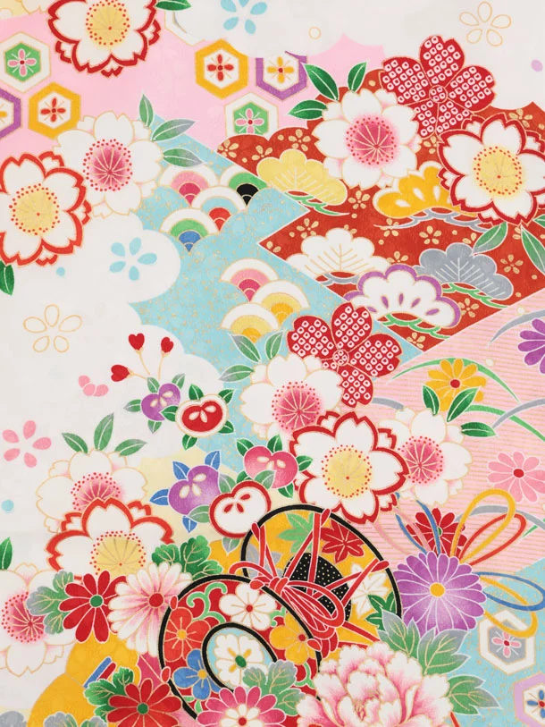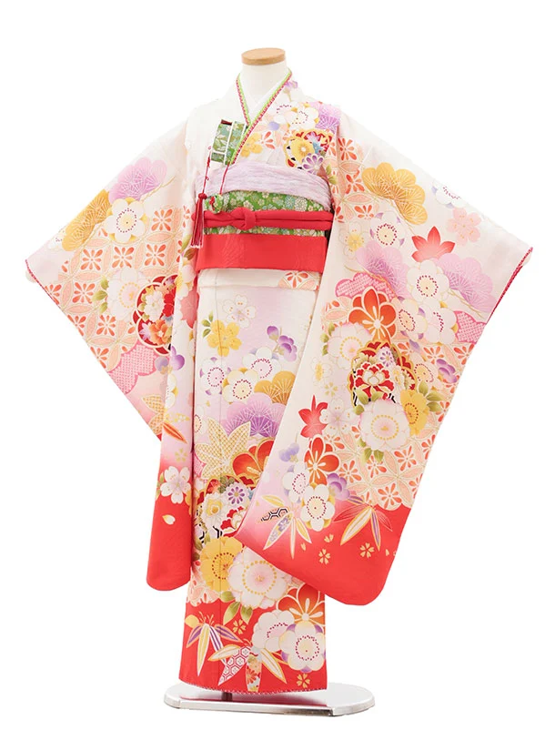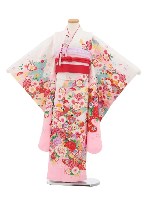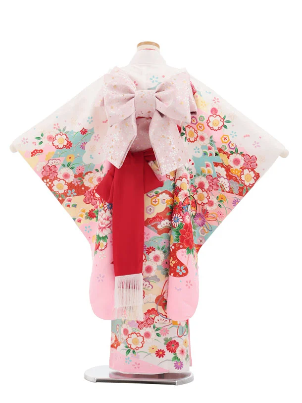 七五三(7歳結び帯)Y674 白地裾ピンク鼓に花づくし