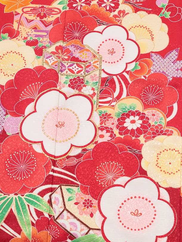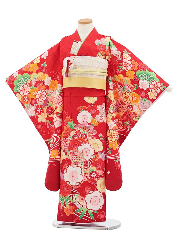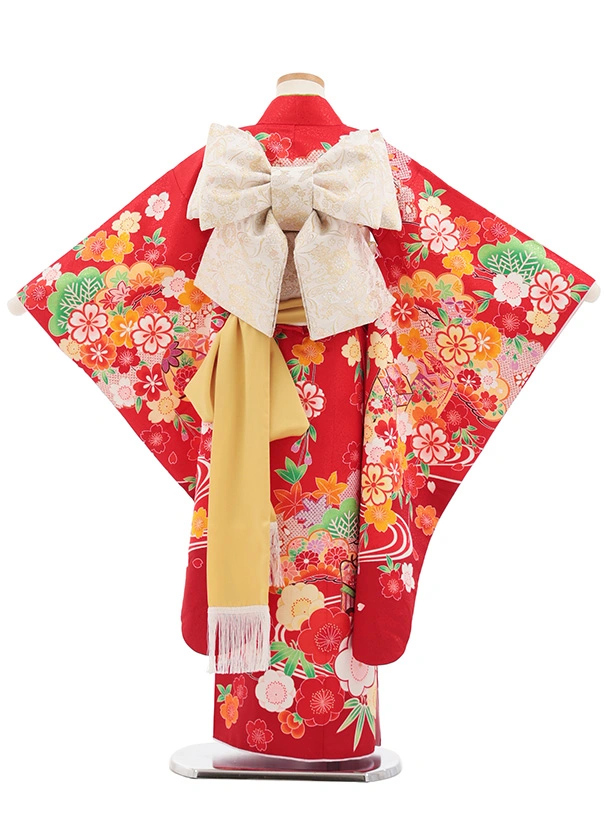 七五三(7歳結び帯)Y692 赤地 梅に貝桶