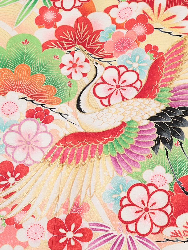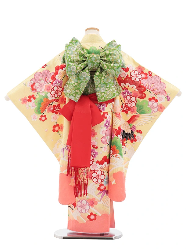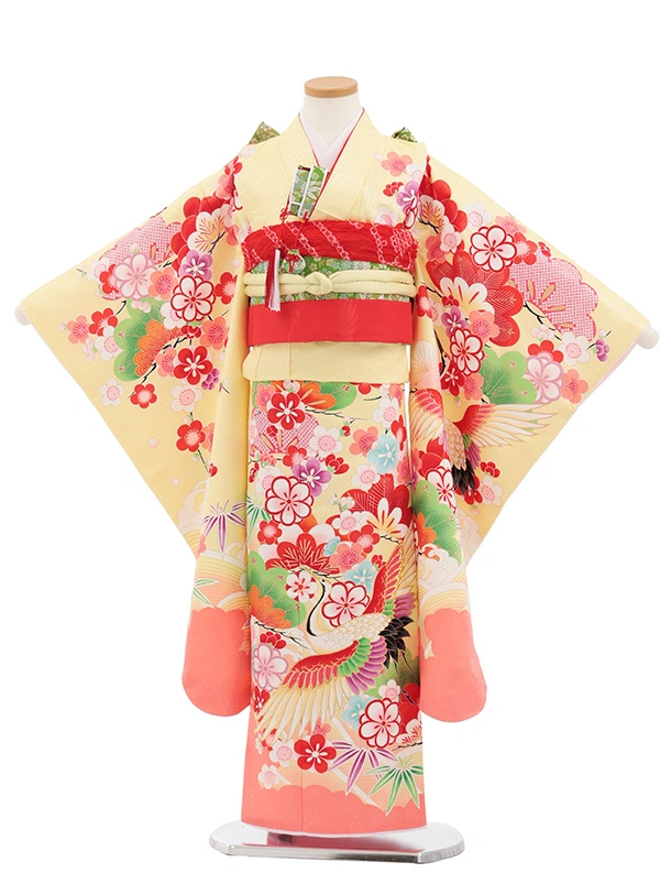 七五三(7歳結び帯)Y694 黄色裾ピンク鶴に吉祥文様