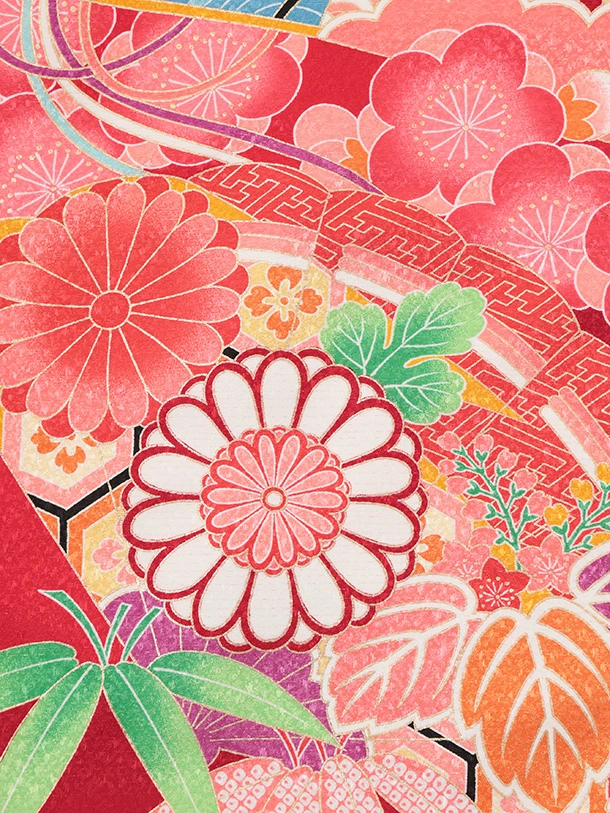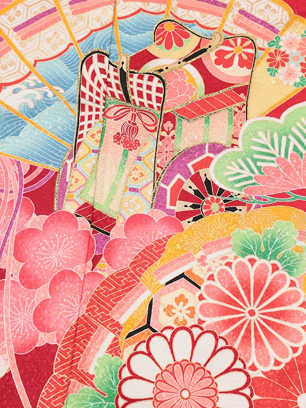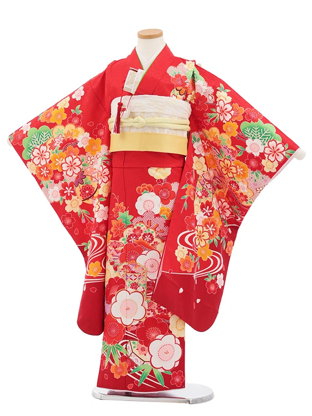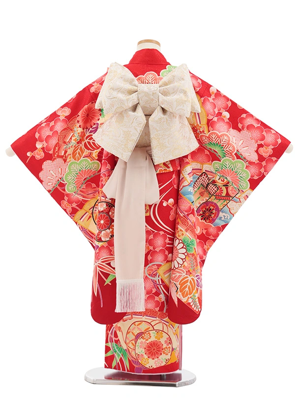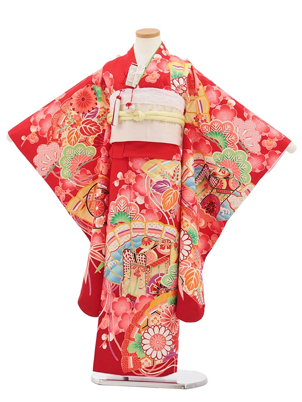 七五三(7歳結び帯)Y698 赤地 梅に檜扇御所車