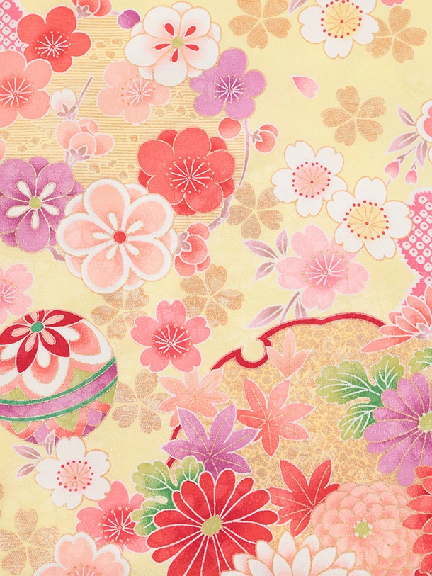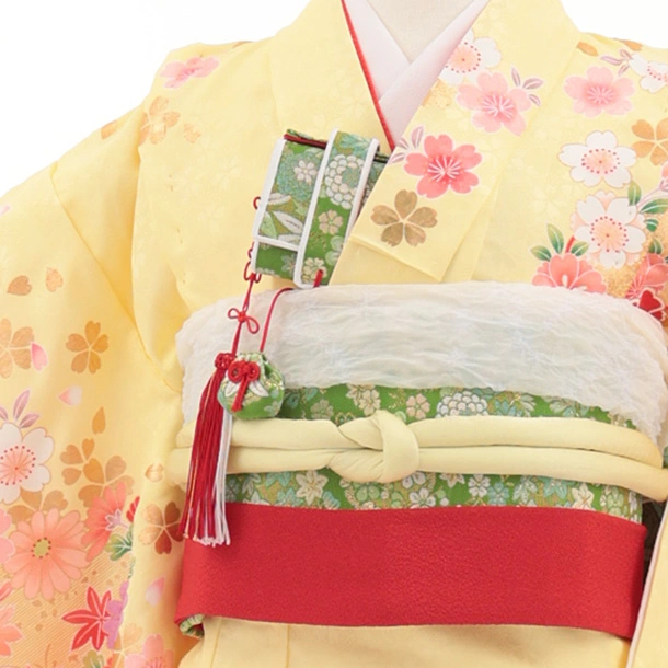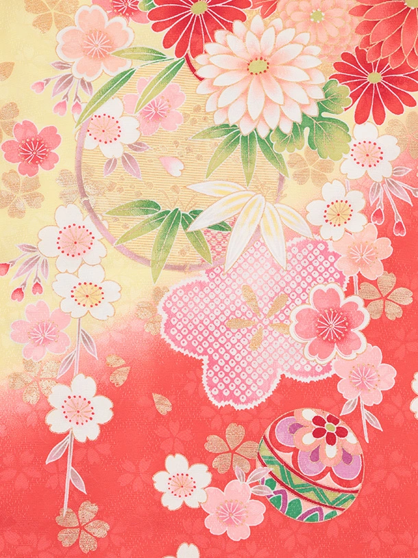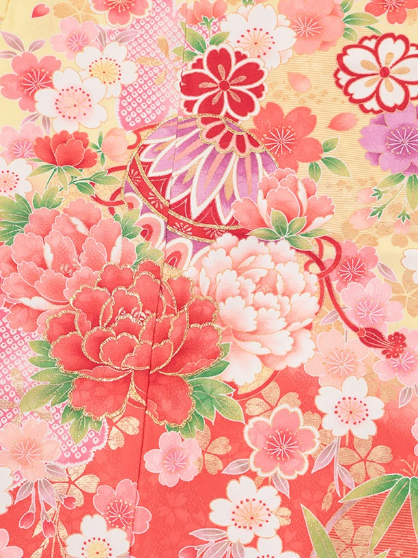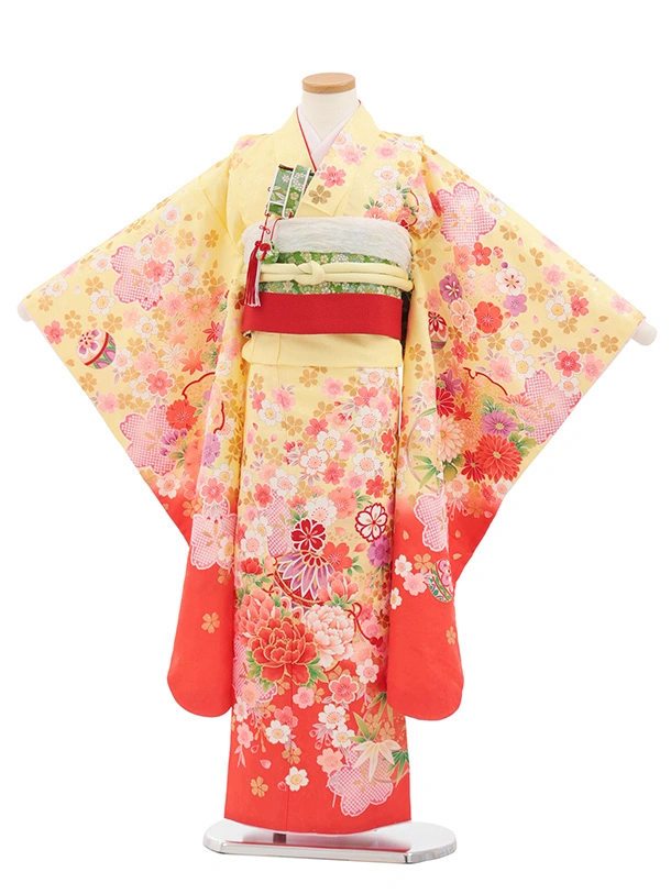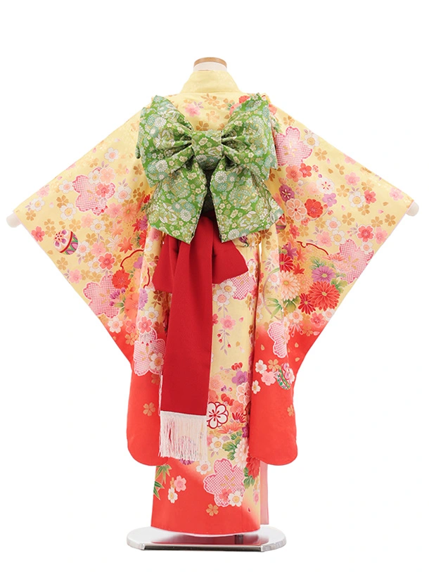 七五三(7歳結び帯)Y701 黄色裾朱赤 鼓に花