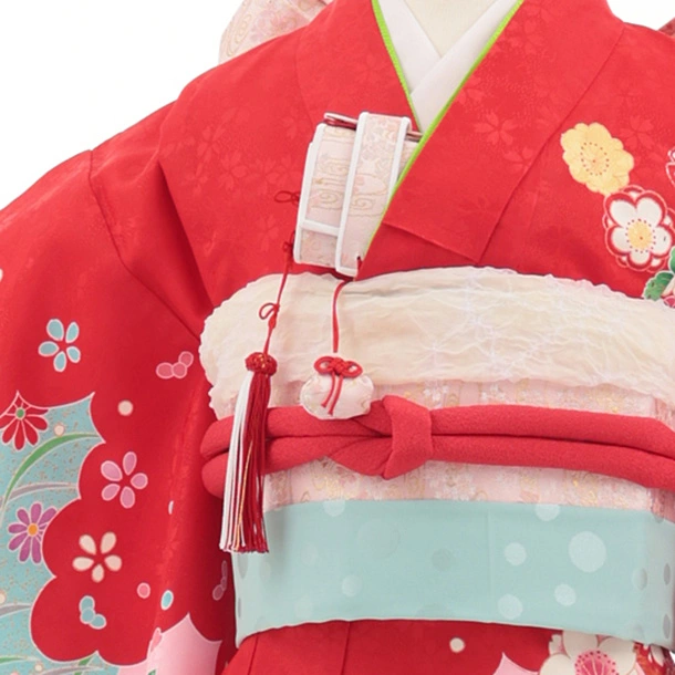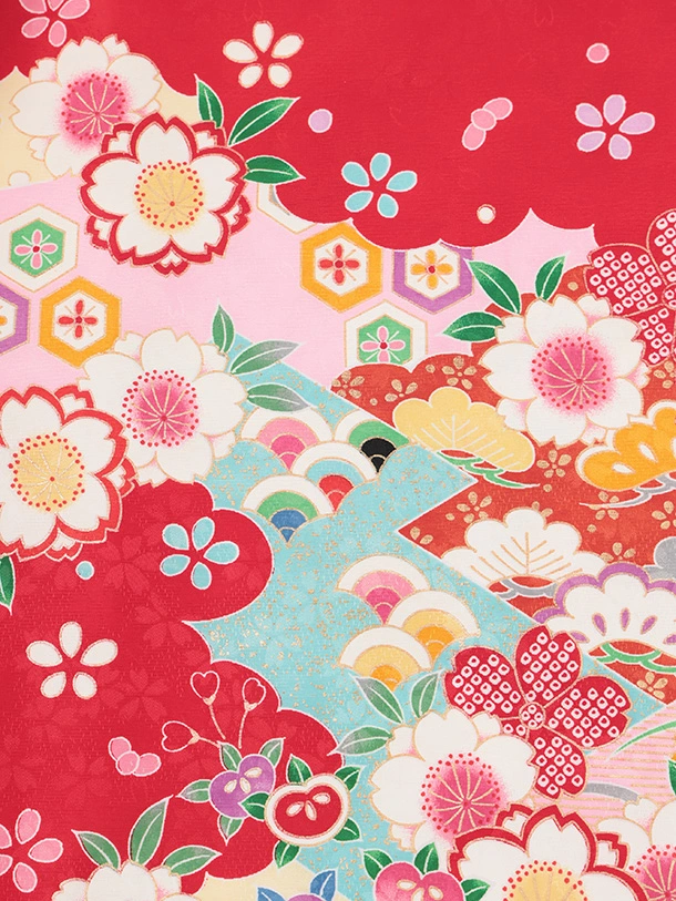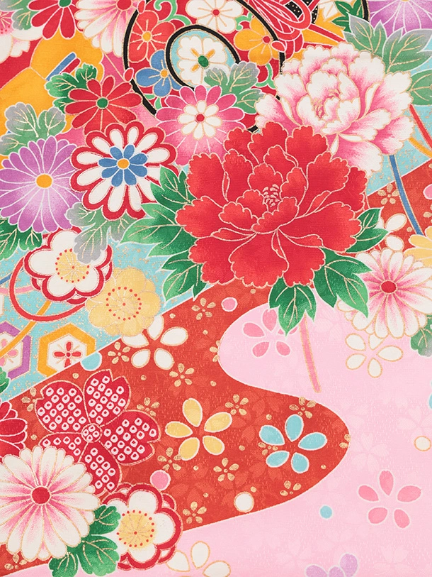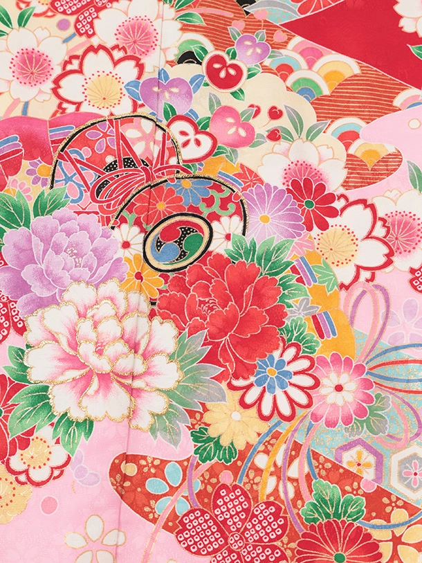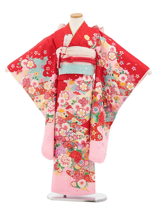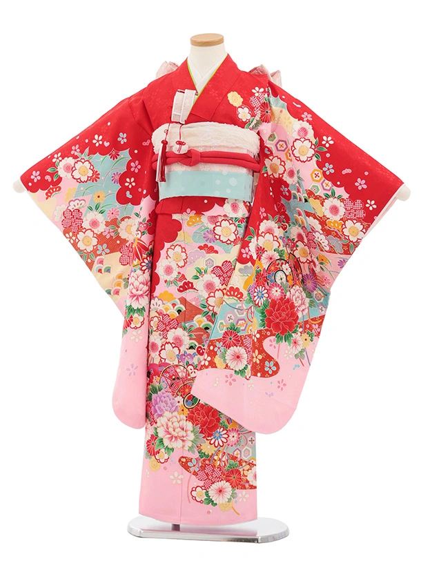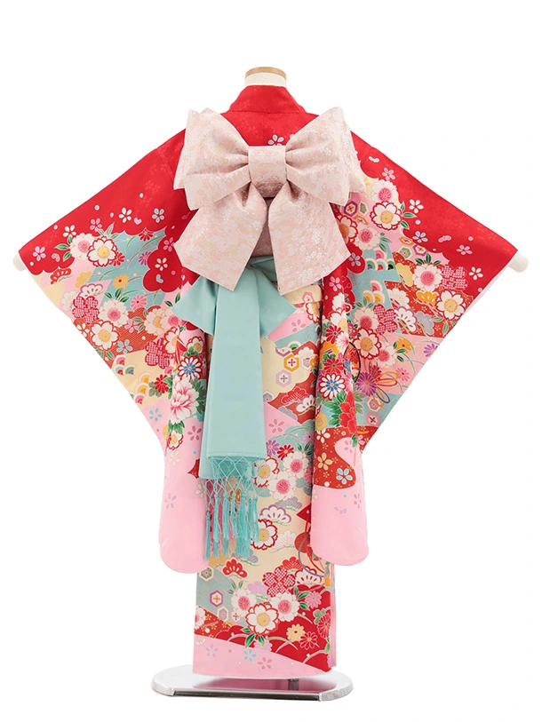 七五三(7歳結び帯)Y710 赤地裾ピンク 鼓に花