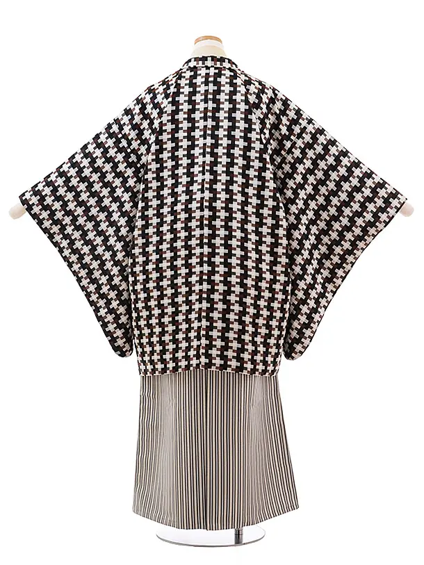 ジュニア袴男児Z031おりびとアイボリーブラウンチェック×銀ストライプ袴