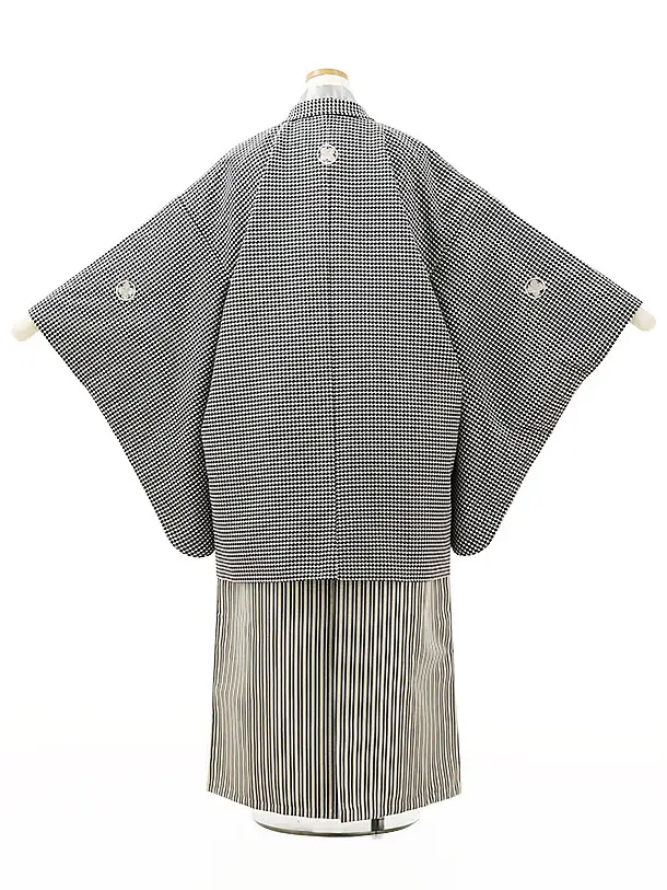 小学生男児袴レンタルZ314 黒千鳥格子紋付×グレーシルバーストライプ