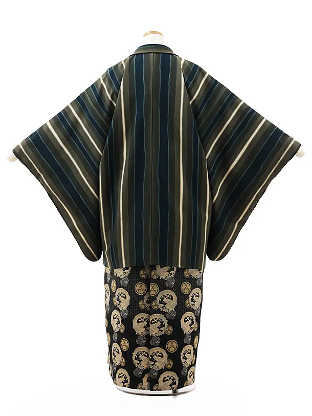 かんたん着付小学生 卒業式 袴 男児Z557 グリーン縞×黒銀
