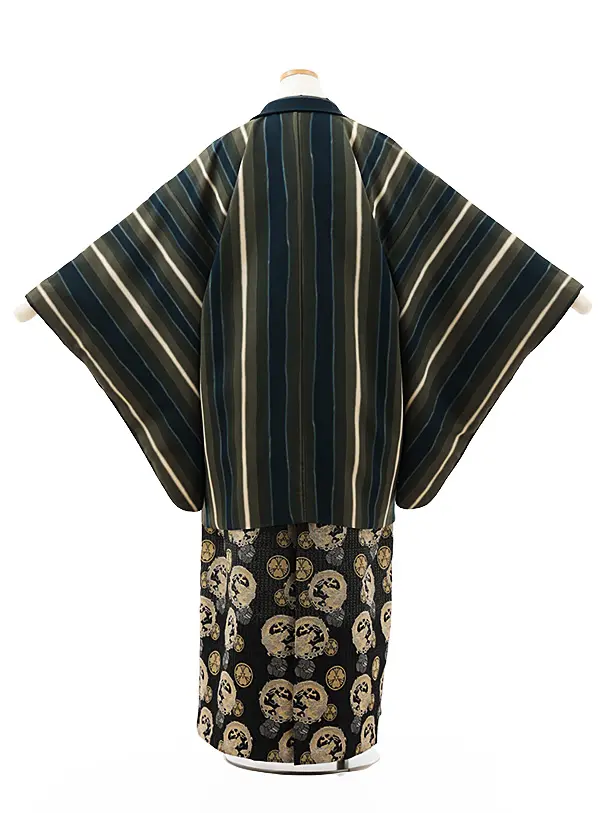 かんたん着付小学生 卒業式 袴 男児Z558 グリーン縞×黒銀