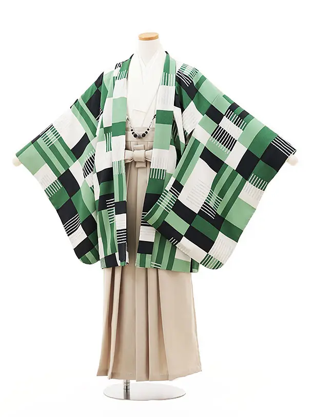 小学生男児袴レンタルZ647 ベージュメタリック紋付×グリーンぼかし