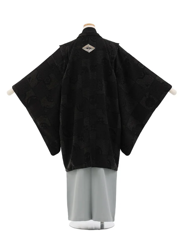 ジュニア袴男児Z743 華徒然 黒市松しゃれ紋×グレー袴