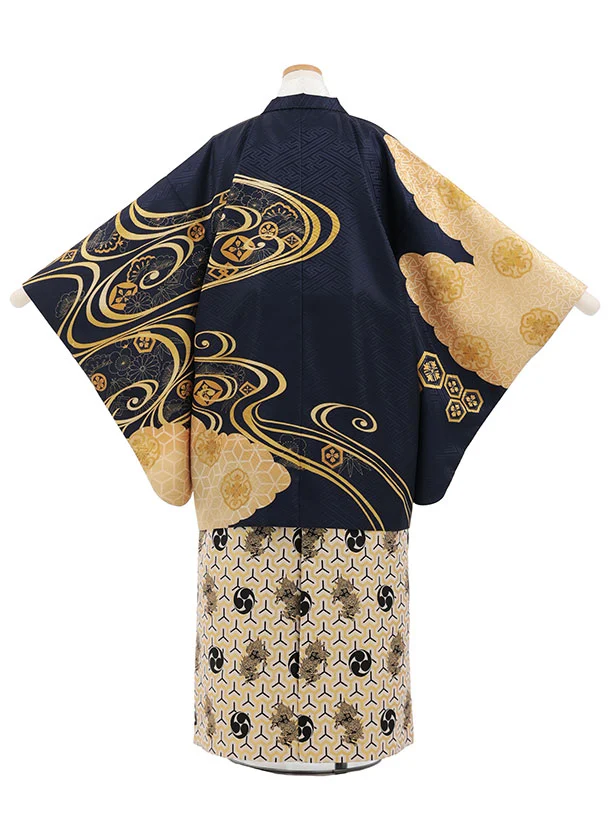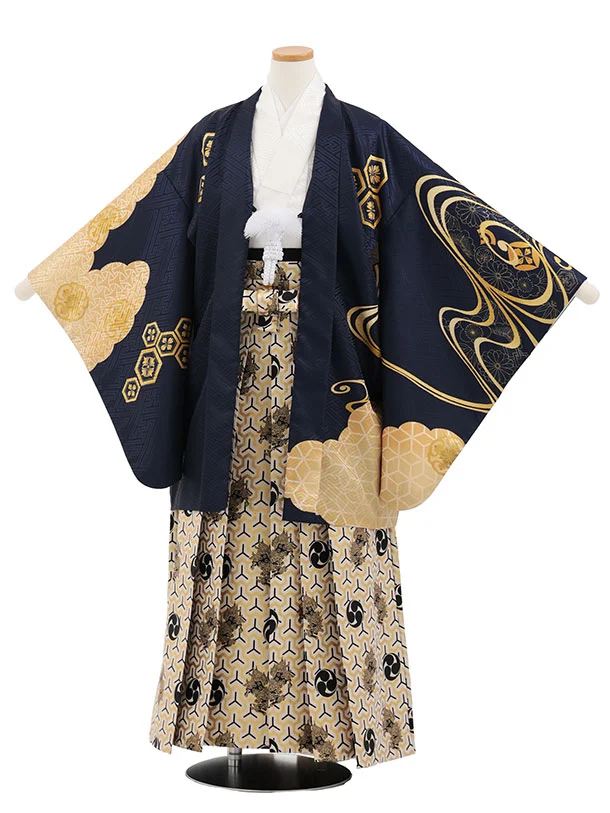 小学生男児袴レンタルZ893 紺ゴールド流水×白ゴールド
