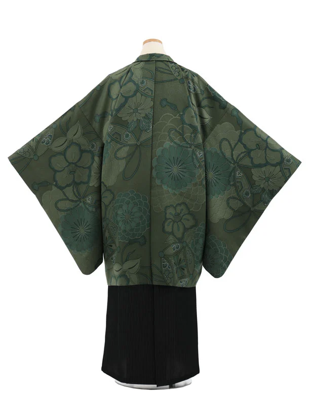 かんたん着付小学生男児袴レンタルZ899 緑七宝椿×黒ストライプ