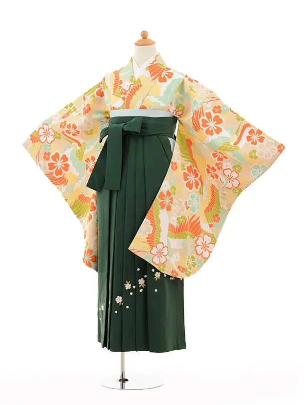小学生 卒業式 袴 女児9136 クリーム鶴桜×グリーン袴