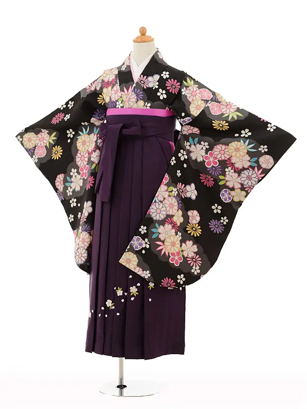 小学生卒業式袴レンタル(女の子)9178 黒地グレー雲取り花