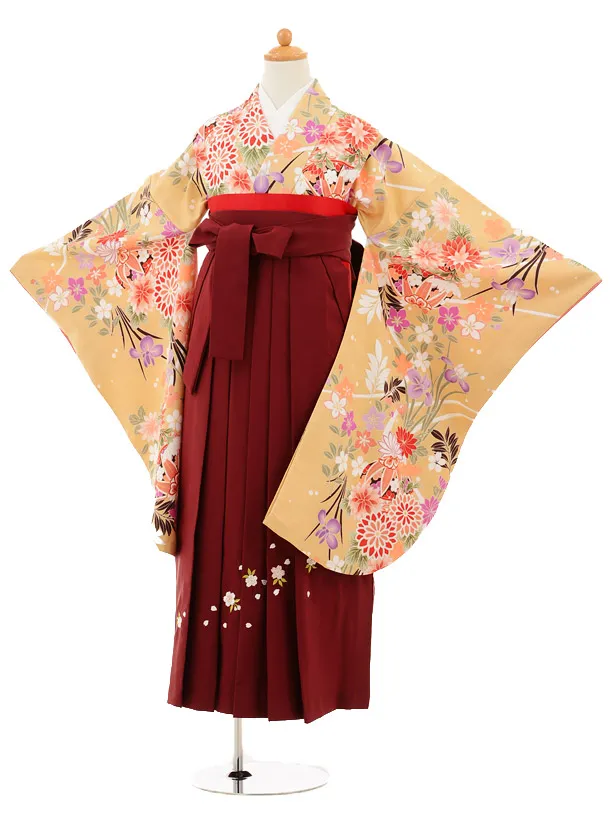小学生卒業式袴レンタル(女の子)9205 ベージュ地花×エンジ