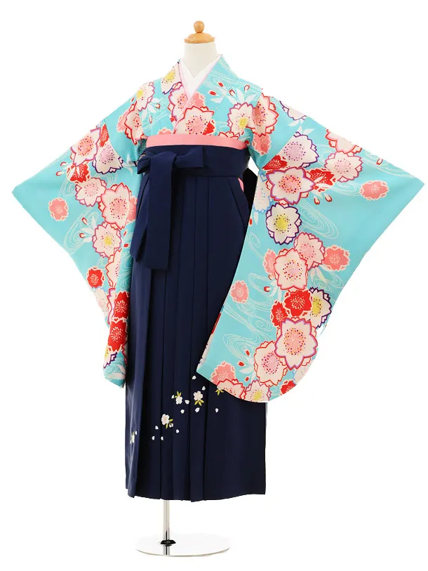 小学生卒業式袴レンタル(女の子)9213 水色流水桜×紺袴