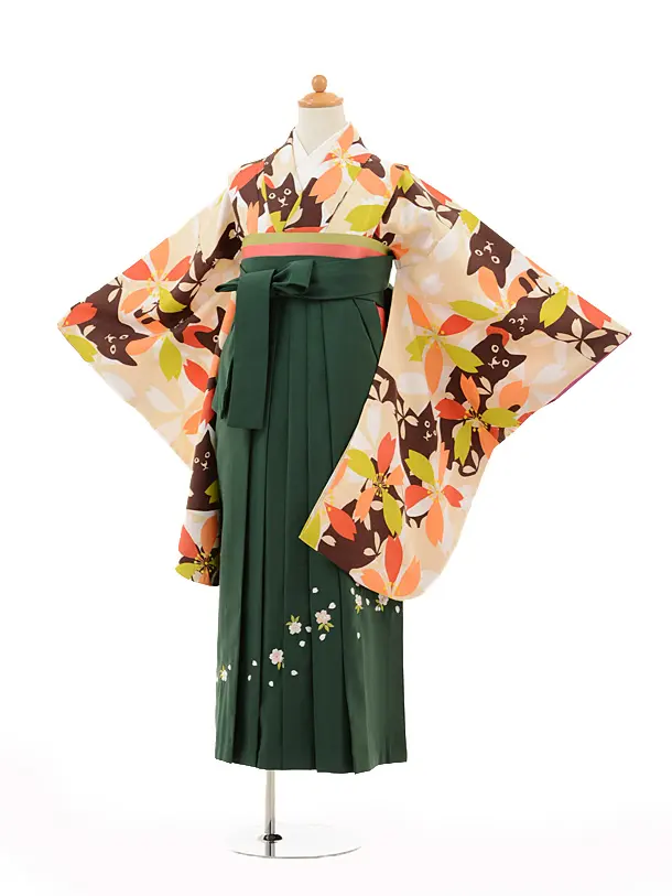 小学生卒業式袴レンタル(女の子)9227 ベージュ桜と猫