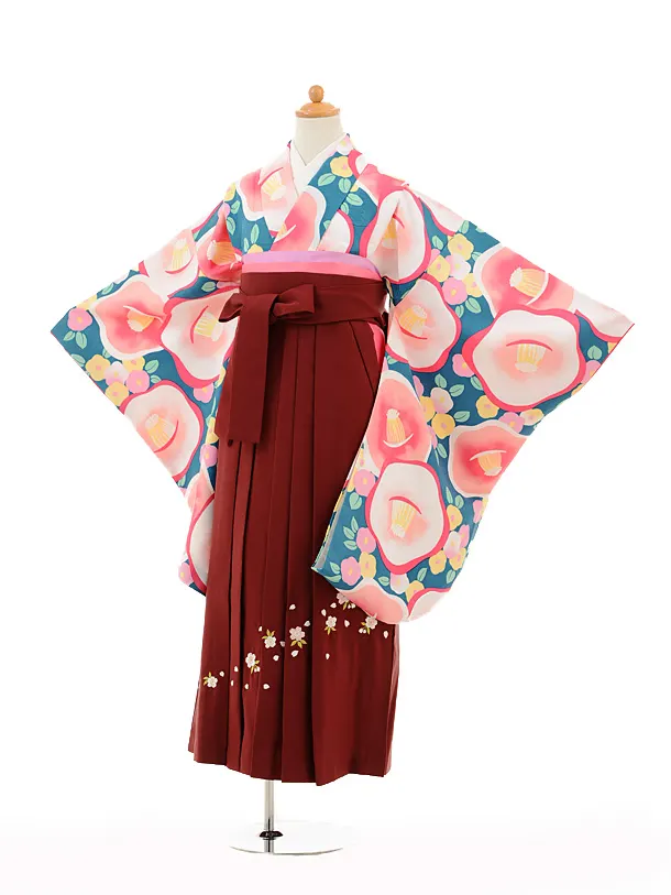小学生卒業式袴レンタル(女の子)9233 青緑ピンク梅×エンジ