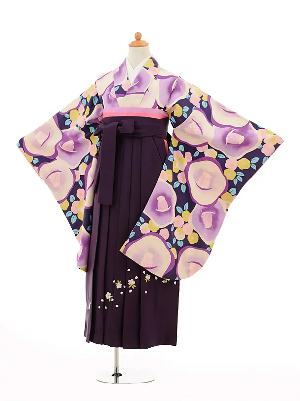 小学生卒業式袴レンタル(女の子)9239 紫地椿×パープル袴