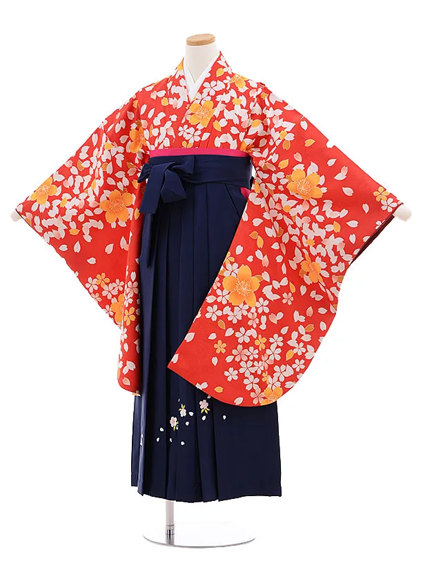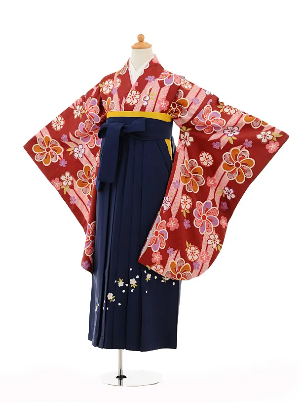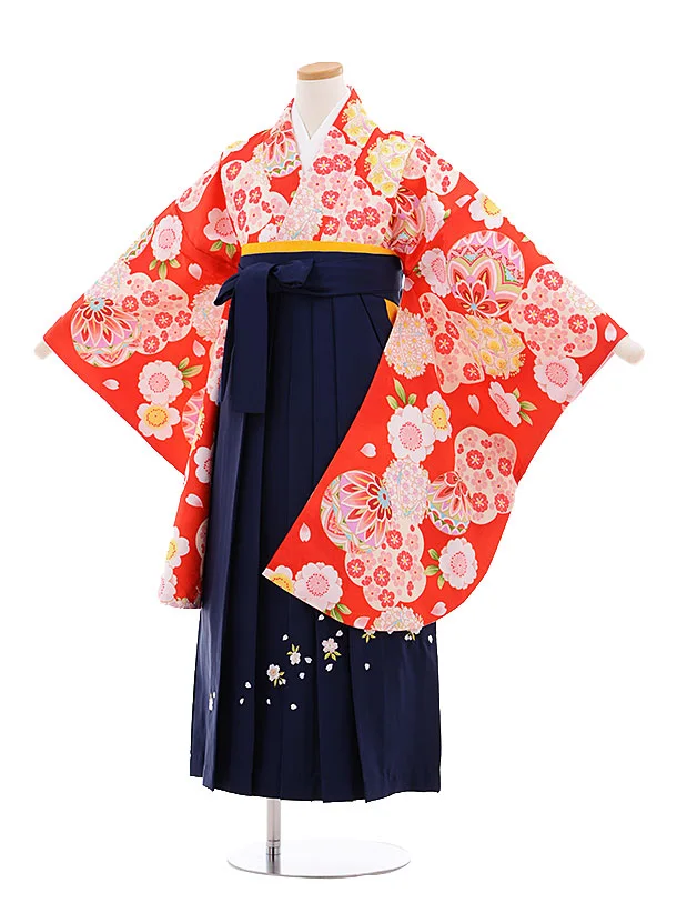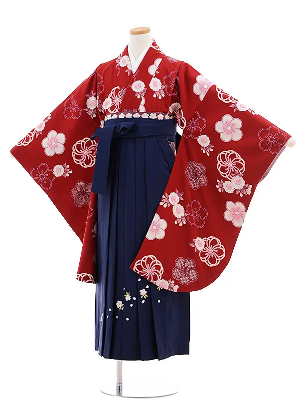 小学生卒業式袴レンタル(女の子)9251 エンジ矢絣梅×紺袴