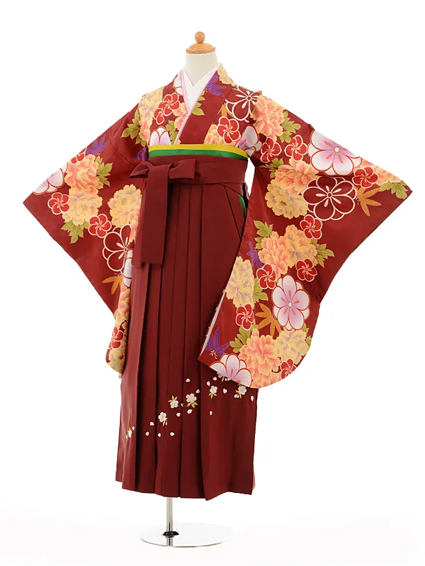 小学生卒業式袴レンタル(女の子)9254 エンジ色牡丹×エンジ