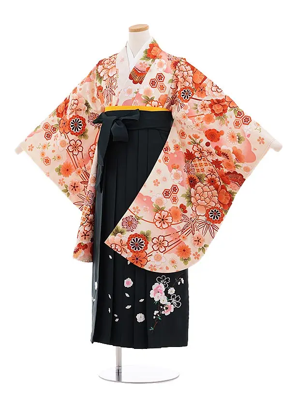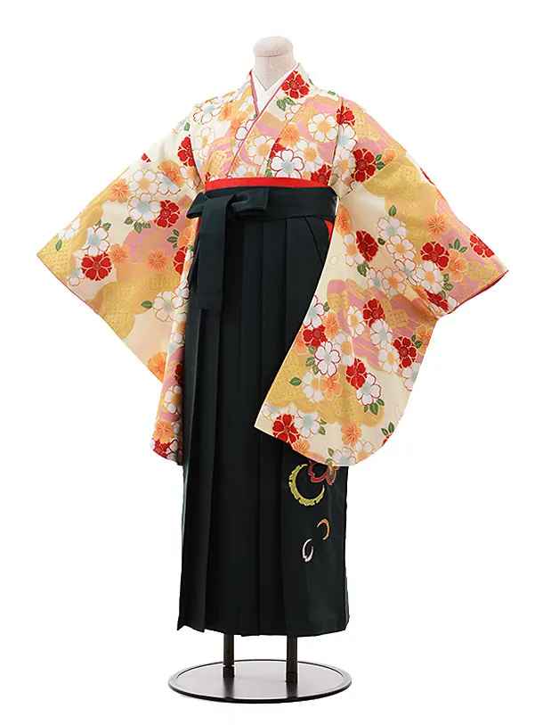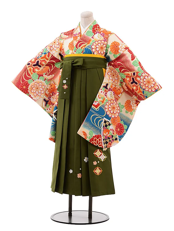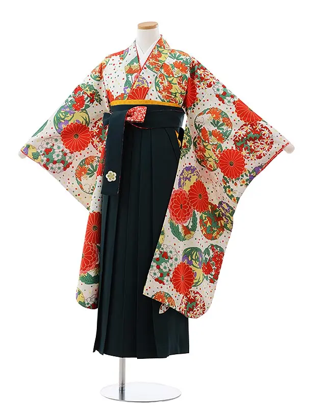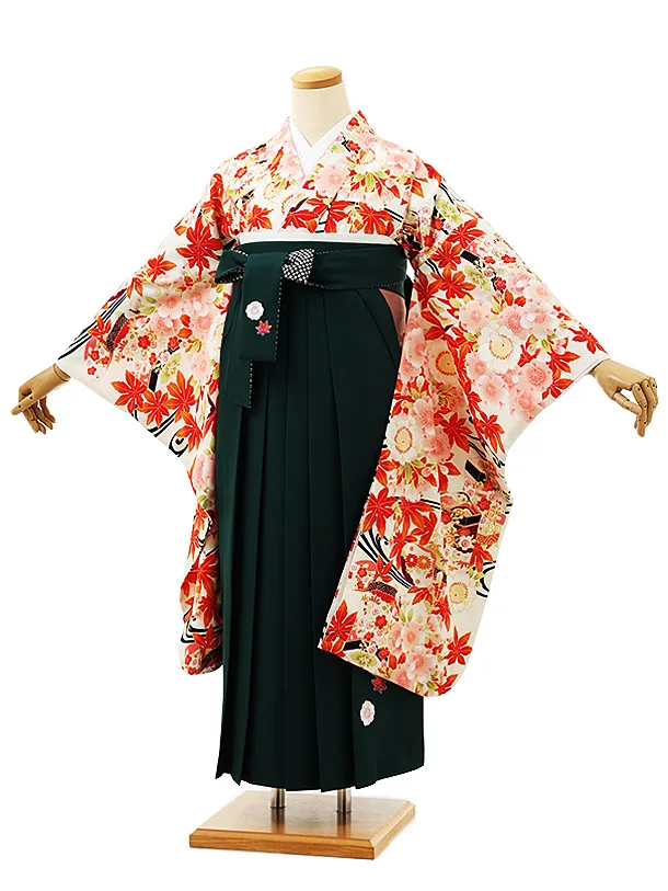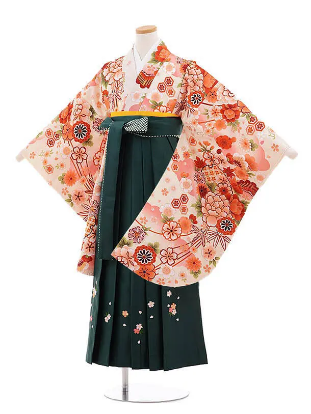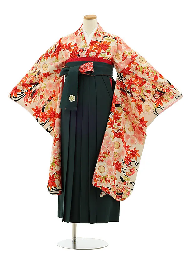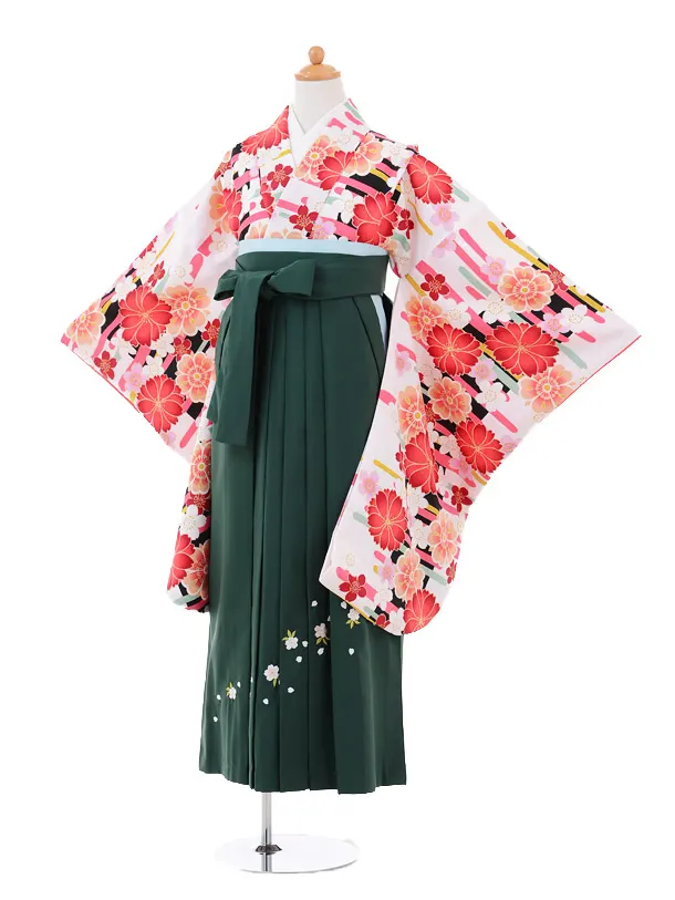 小学生卒業式袴レンタル(女の子)9273 白地赤花×グリーン袴