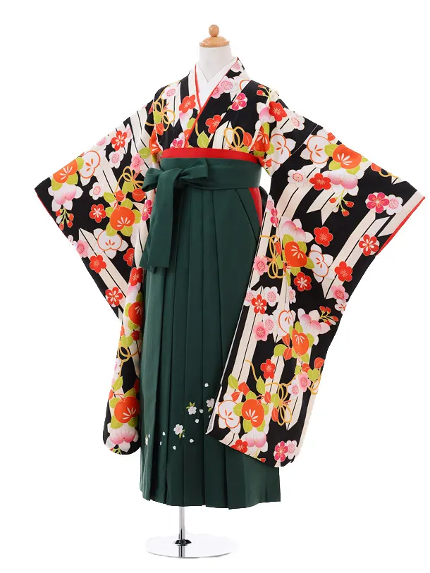 小学生卒業式袴レンタル(女の子)9350 黒矢絣橘×グリーン袴