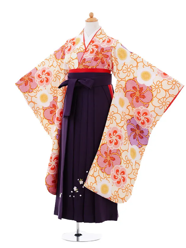 小学生卒業式袴レンタル(女の子)9351 クリーム梅×紫袴