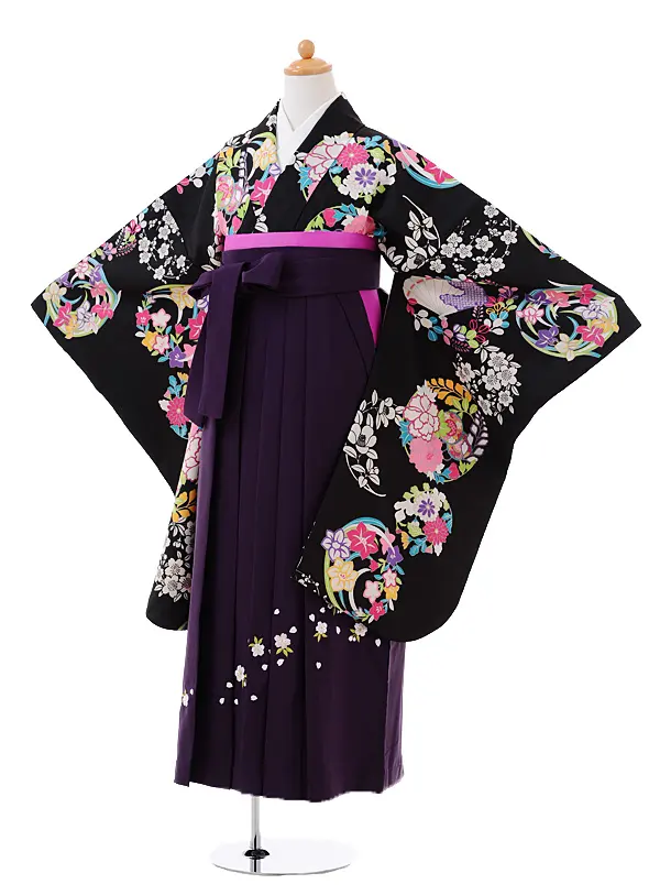 小学生卒業式袴レンタル(女の子)9382黒地花丸×パープル袴