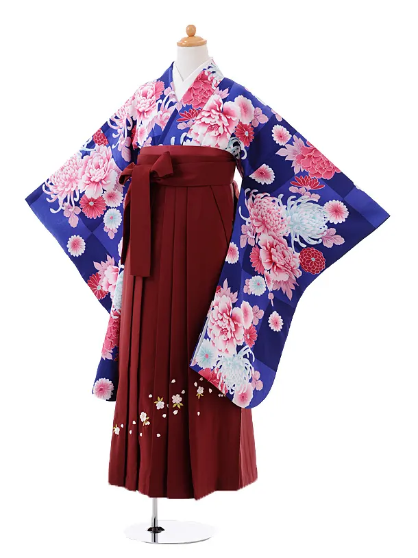 小学生卒業式袴レンタル(女の子)9383紺地菊ぼたん×エンジ