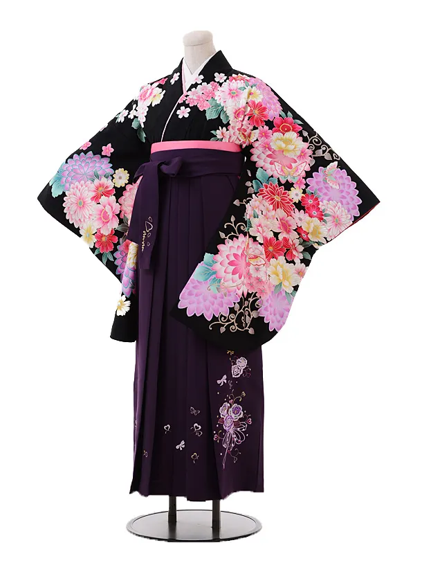 小学生卒業式袴レンタル(女の子)9390黒地花に蝶×パープル