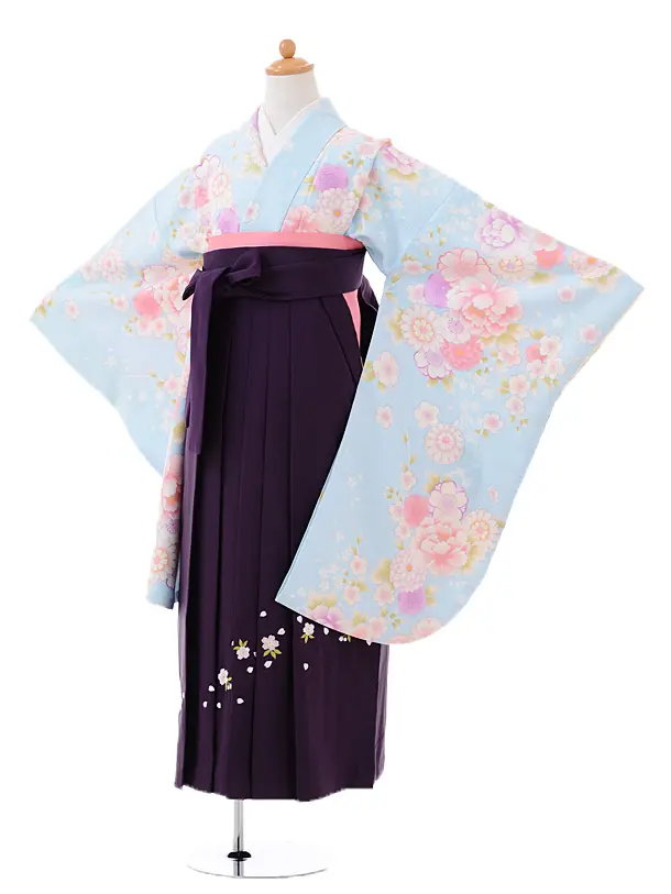 小学生卒業式袴レンタル(女の子)9392水色桜花×パープル袴