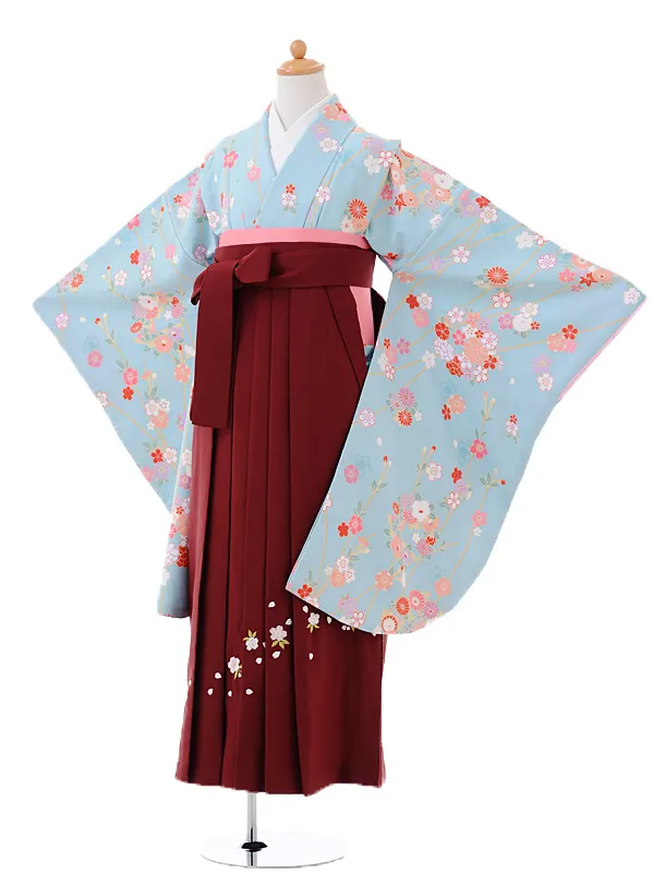 小学生卒業式袴レンタル(女の子)9395水色花王×エンジ袴