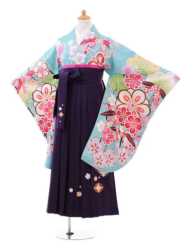 小学生卒業式袴レンタル(女の子)9417水色松竹梅×パープル