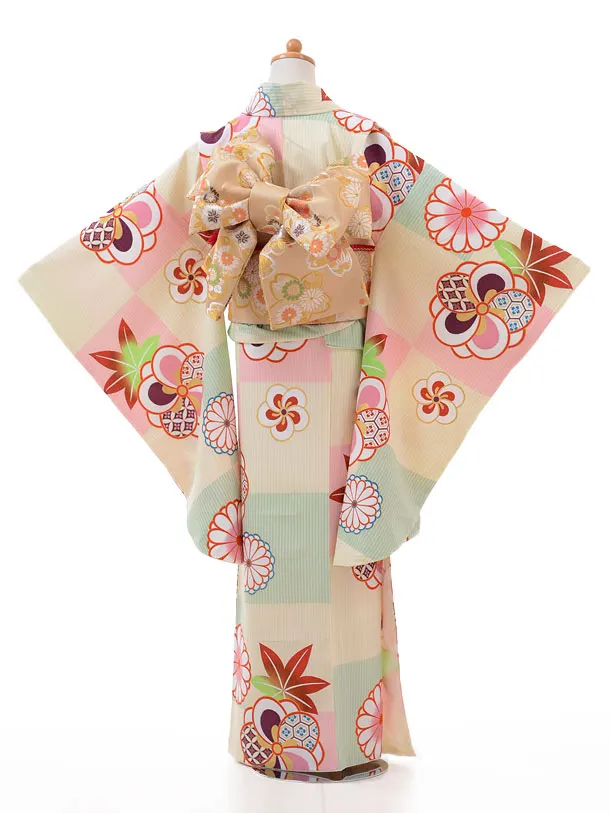 ジュニア着物jh9426クリーム色 菊ねじり梅