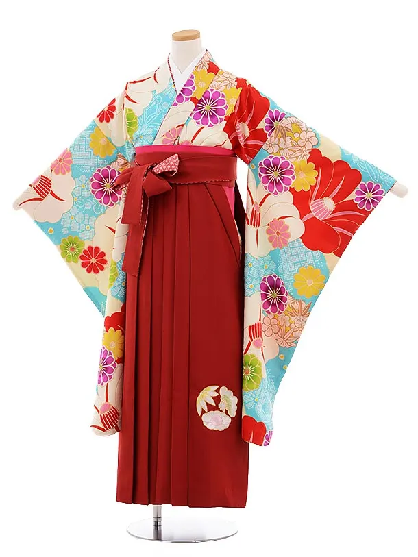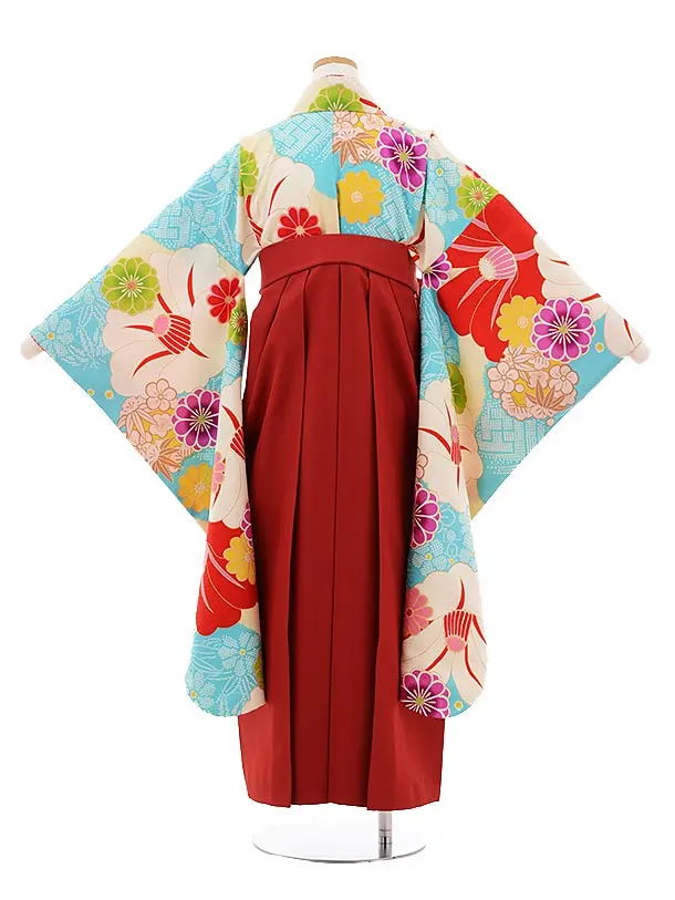 小学生卒業式袴9474瑞城さくら×JAPANSTYLE水色に椿×エンジ袴