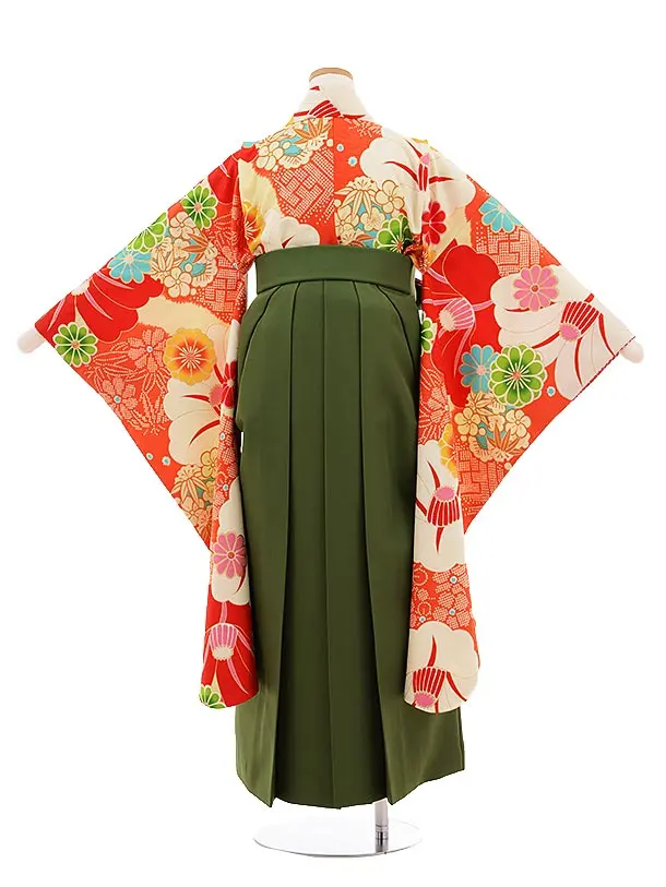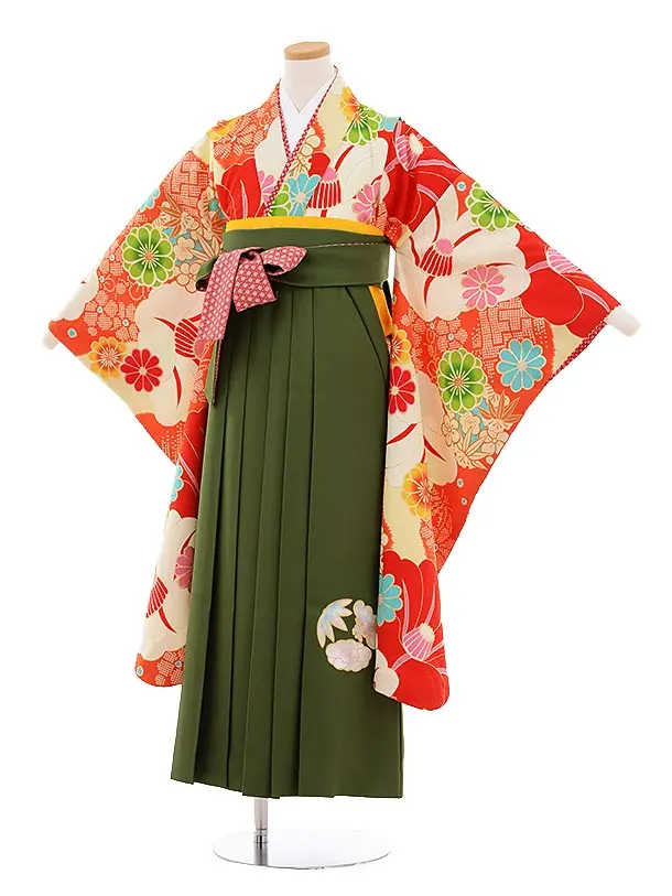小学生卒業式袴9475瑞城さくら×JAPANSTYLEオレンジに椿グリーン袴